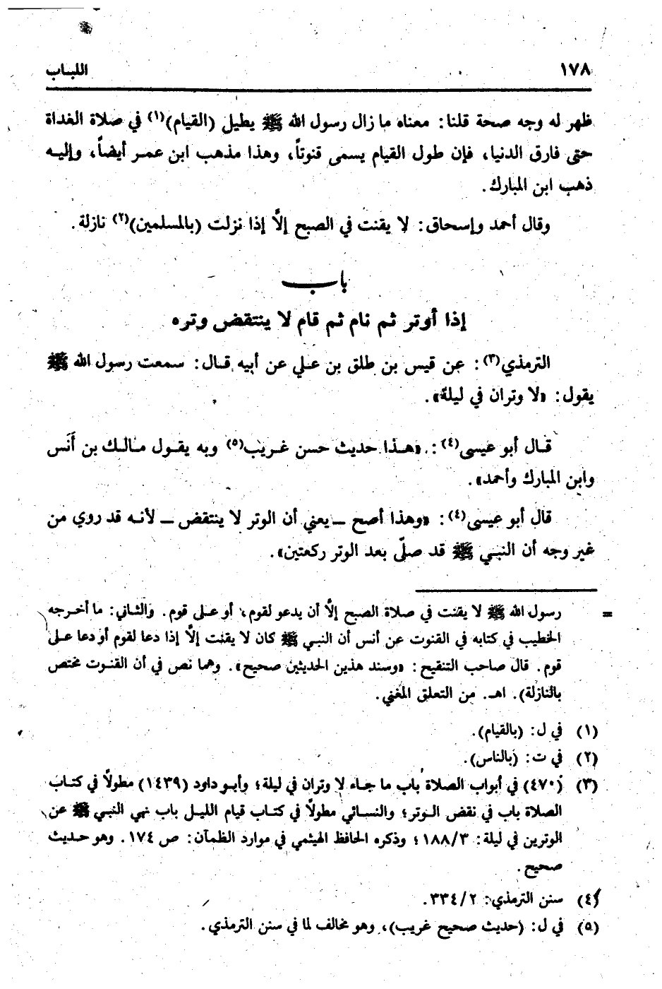 التِّرْمِذِيّ: عَن قيس بن طلق بن عَليّ عَن أَبِيه قَالَ: سَمِعت رَسُول الله [صلى الله عَلَيْهِ وَسلم] يَقُول: " لَا وتران فِي لَيْلَة ".