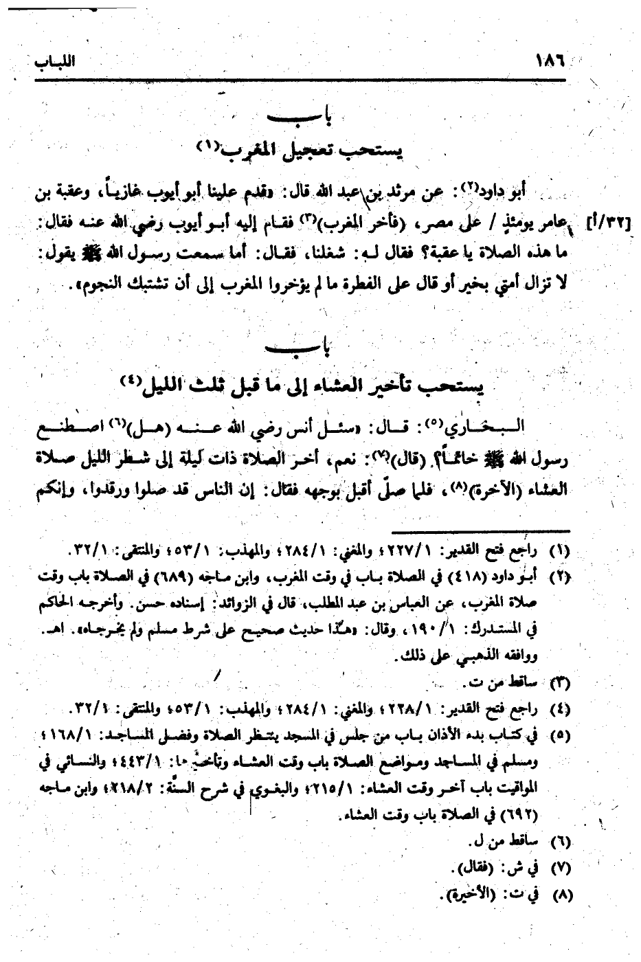 أَبُو دَاوُد: عَن مرْثَد بن عبد الله قَالَ: " قدم علينا أَبُو أَيُّوب غازيا، وَعقبَة بن عَامر يَوْمئِذٍ / على مصر، (فَأخر الْمغرب) فَقَامَ إِلَيْهِ أَبُو أَيُّوب رَضِي الله عَنهُ فَقَالَ: مَا هَذِه الصَّلَاة يَا عقبَة؟ فَقَالَ لَهُ: شغلنا، فَقَالَ: أما سَمِعت رَسُول الله [صلى الله عَلَيْهِ وَسلم] يَقُول: لَا تزَال أمتِي بِخَير أَو قَالَ على الْفطْرَة مَا لم يؤخروا الْمغرب إِلَى أَن تشتبك النُّجُوم ".