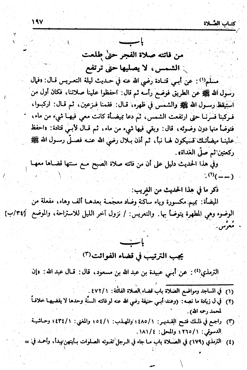 مُسلم: عَن أبي قَتَادَة رَضِي الله عَنهُ فِي حَدِيث لَيْلَة التَّعْرِيس قَالَ: " فَمَال رَسُول الله [صلى الله عَلَيْهِ وَسلم] عَن الطَّرِيق فَوضع رَأسه ثمَّ قَالَ: احْفَظُوا علينا صَلَاتنَا، فَكَانَ أول من اسْتَيْقَظَ رَسُول الله [صلى الله عَلَيْهِ وَسلم] وَالشَّمْس فِي ظَهره، قَالَ: فقمنا فزعين، ثمَّ قَالَ: اركبوا، فَرَكبْنَا فسرنا حَتَّى ارْتَفَعت الشَّمْس، ثمَّ دَعَا بميضأة كَانَت معي فِيهَا شَيْء من مَاء، فَتَوَضَّأ مِنْهَا دون وضوئِهِ، قَالَ: وَبَقِي فِيهَا شَيْء من مَاء، ثمَّ قَالَ لأبي قَتَادَة: " احفظ علينا ميضأتك فسيكون لَهَا نبأ، ثمَّ أذن بِلَال رَضِي الله عَنهُ فصلى رَسُول الله [صلى الله عَلَيْهِ وَسلم] رَكْعَتَيْنِ ثمَّ صلى الْغَدَاة ".
