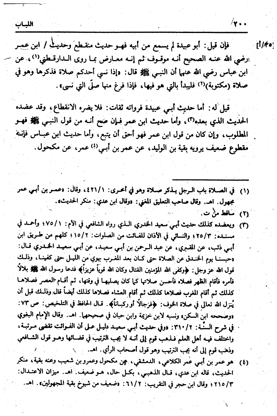 قيل لَهُ: أما حَدِيث أبي عُبَيْدَة فرواته ثِقَات: فَلَا يضرّهُ الِانْقِطَاع، وَقد عضده الحَدِيث الَّذِي بعده، وَأما حَدِيث ابْن عمر فَإِن صَحَّ أَنه من قَول النَّبِي [صلى الله عَلَيْهِ وَسلم] فَهُوَ الْمَطْلُوب، وَإِن كَانَ من قَول ابْن عمر فَهُوَ أَحَق أَن يتبع، وَأما حَدِيث ابْن عَبَّاس فَإِنَّهُ مَقْطُوع ضَعِيف يرويهِ بَقِيَّة بن الْوَلِيد، عَن عمر بن أبي عمر، عَن مَكْحُول.