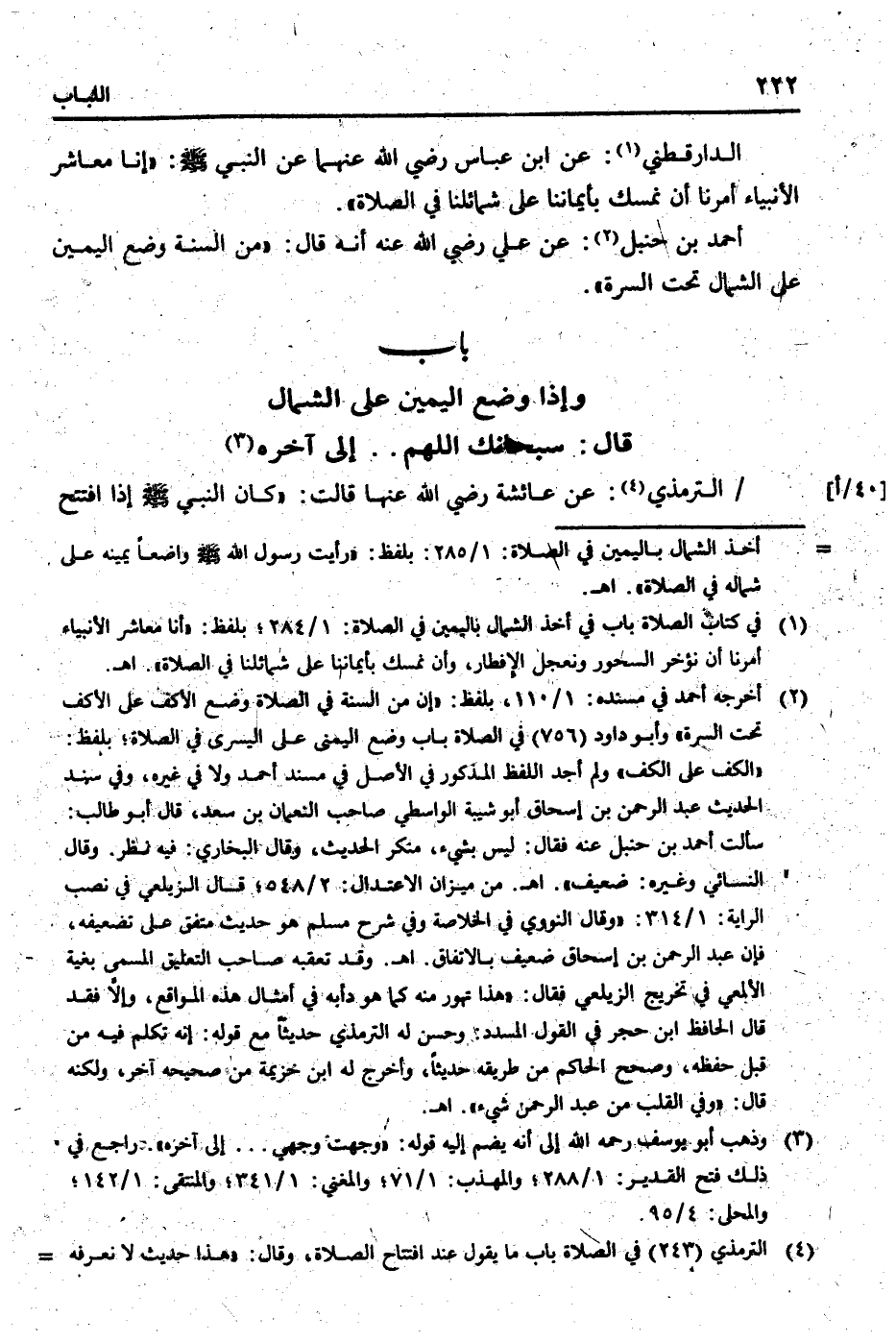 الدَّارَقُطْنِيّ: عَن ابْن عَبَّاس رَضِي الله عَنْهُمَا عَن النَّبِي [صلى الله عَلَيْهِ وَسلم] : " إِنَّا معاشر الْأَنْبِيَاء أمرنَا أَن نمسك بأيماننا على شَمَائِلنَا فِي الصَّلَاة ".