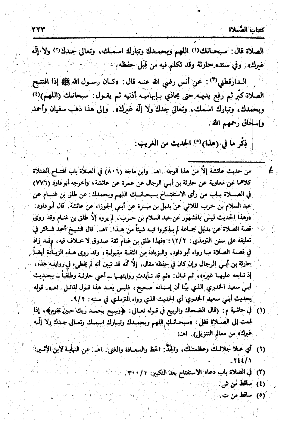 الصَّلَاة قَالَ: سُبْحَانَكَ اللَّهُمَّ وَبِحَمْدِك وتبارك اسْمك، وَتَعَالَى جدك وَلَا إِلَه غَيْرك ". وَفِي سَنَده حَارِثَة وَقد تكلم فِيهِ من قبل حفظه.