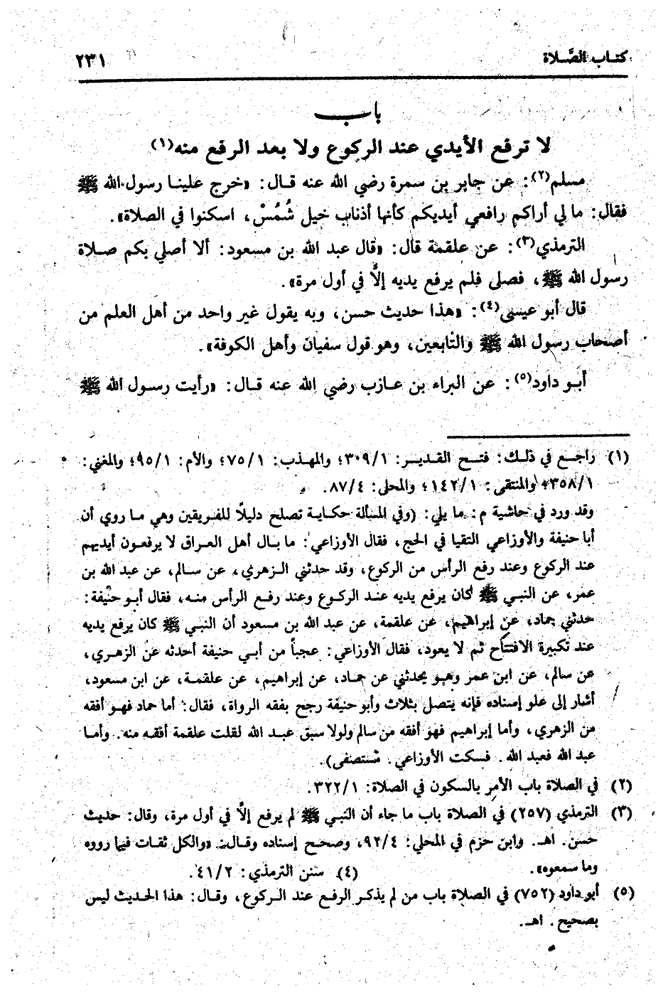 التِّرْمِذِيّ: عَن عَلْقَمَة قَالَ: " قَالَ عبد الله بن مَسْعُود: أَلا أُصَلِّي بكم صَلَاة رَسُول الله [صلى الله عَلَيْهِ وَسلم] ، فصلى فَلم يرفع يَدَيْهِ إِلَّا فِي أول مرّة ".