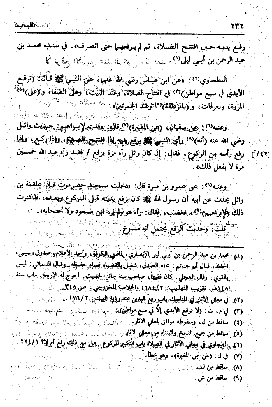 الطَّحَاوِيّ: " عَن ابْن عَبَّاس رَضِي الله عَنْهُمَا، عَن النَّبِي [صلى الله عَلَيْهِ وَسلم] قَالَ: (ترفع الْأَيْدِي فِي سبع مَوَاطِن) فِي افْتِتَاح الصَّلَاة، وَعند الْبَيْت، وعَلى الصَّفَا، و (على) الْمَرْوَة، وبعرفات، و (بِالْمُزْدَلِفَةِ) وَعند الْجَمْرَتَيْن ". " وَعنهُ: عَن سُفْيَان، (عَن الْمُغيرَة) قَالَ: " قلت لإِبْرَاهِيم: حَدِيث وَائِل رَضِي الله عَنهُ (أَنه) رأى النَّبِي [صلى الله عَلَيْهِ وَسلم] يرفع يَدَيْهِ إِذا افْتتح الصَّلَاة، وَإِذا ركع، وَإِذا رفع رَأسه من الرُّكُوع، فَقَالَ: إِن كَانَ وَائِل رَآهُ مرّة يرفع / فقد رَآهُ عبد الله خمسين مرّة لَا يفعل ذَلِك ".