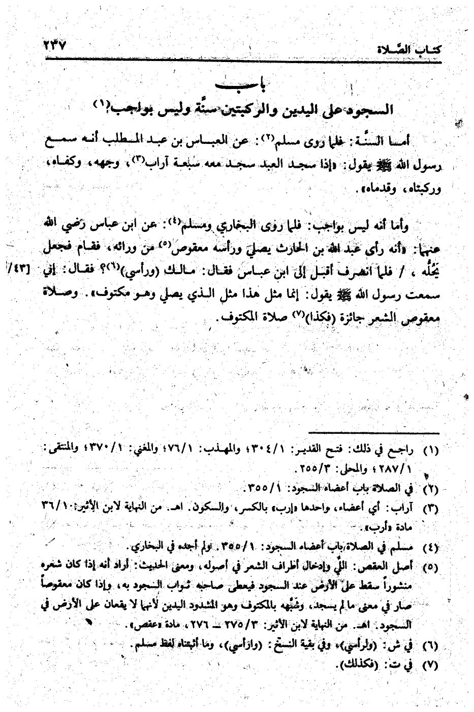 أما السّنة: فَلَمَّا روى مُسلم: عَن الْعَبَّاس بن عبد الْمطلب أَنه سمع رَسُول الله [صلى الله عَلَيْهِ وَسلم] يَقُول: " إِذا سجد العَبْد سجد مَعَه سَبْعَة آرَاب، وَجهه، وَكَفاهُ، وَركبَتَاهُ، وَقَدمَاهُ ".