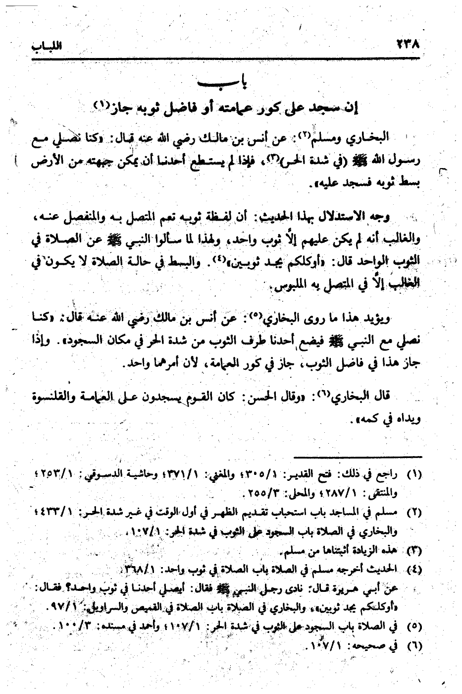 البُخَارِيّ وَمُسلم: عَن أنس بن مَالك رَضِي الله عَنهُ قَالَ: " كُنَّا نصلي مَعَ رَسُول الله [صلى الله عَلَيْهِ وَسلم] (فِي شدَّة الْحر) ، فَإِذا لم يسْتَطع أَحَدنَا أَن يُمكن جَبهته من الأَرْض بسط ثَوْبه فَسجدَ عَلَيْهِ ".
