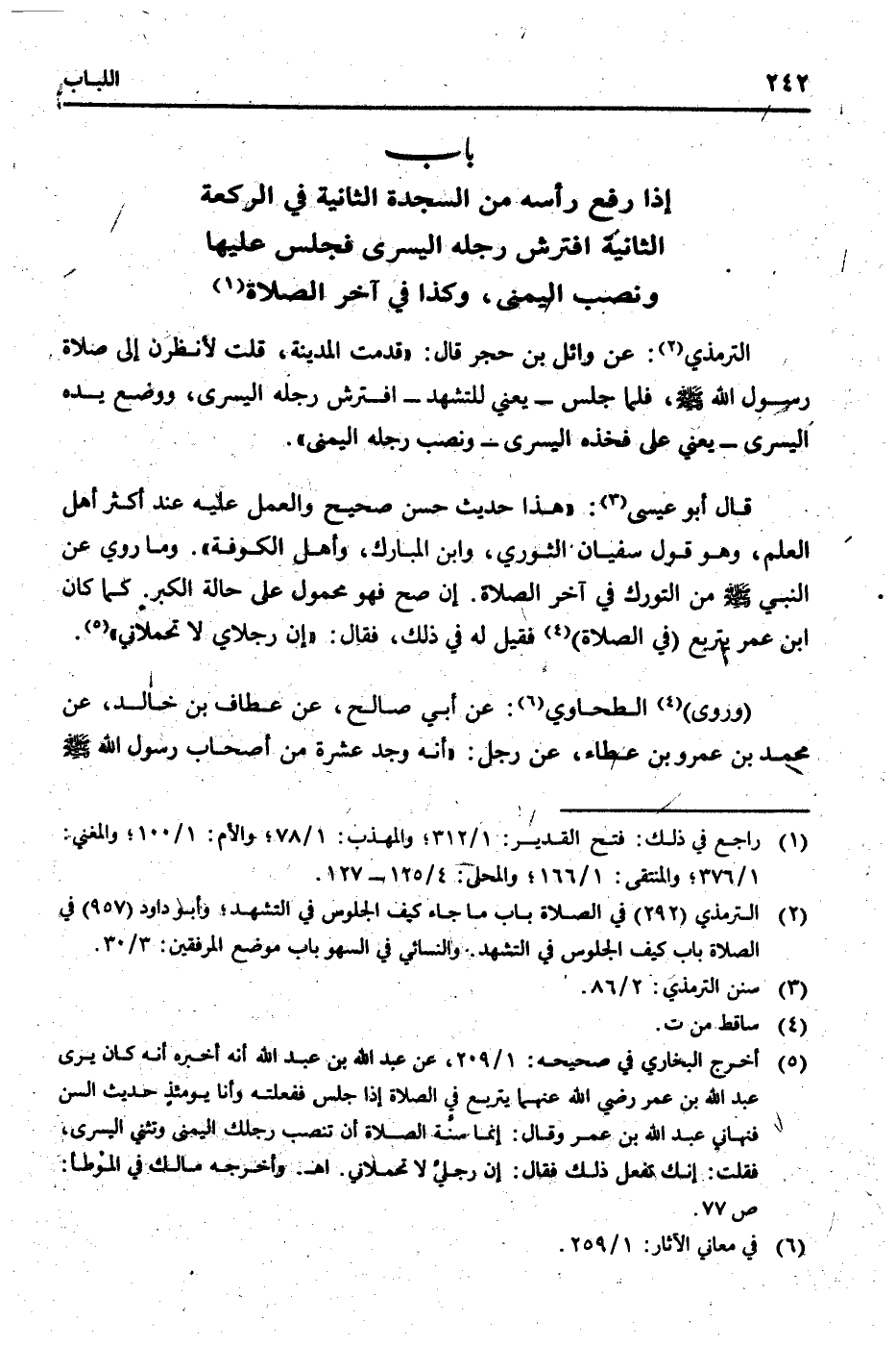 التِّرْمِذِيّ: عَن وَائِل بن حجر قَالَ: " قدمت الْمَدِينَة، قلت لأنظرن إِلَى صَلَاة رَسُول الله [صلى الله عَلَيْهِ وَسلم] ، فَلَمَّا جلس - يَعْنِي للتَّشَهُّد - افترش رجله الْيُسْرَى، وَوضع يَده الْيُسْرَى - يَعْنِي على فَخذه الْيُسْرَى - وَنصب رجله الْيُمْنَى ".