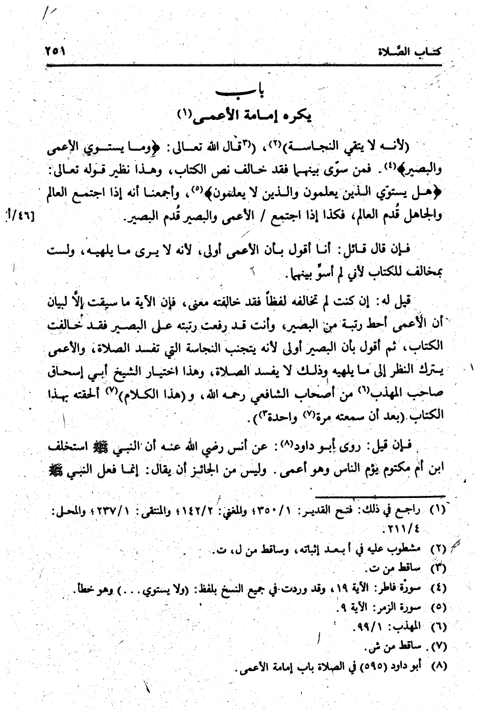 قيل لَهُ: إِن كنت لم تخَالفه لفظا فقد خالفته معنى، فَإِن الْآيَة مَا سيقت إِلَّا لبَيَان أَن الْأَعْمَى أحط رُتْبَة من الْبَصِير، وَأَنت قد رفعت رتبته على الْبَصِير فقد خَالَفت الْكتاب، ثمَّ أَقُول بِأَن الْبَصِير أولى لِأَنَّهُ يتَجَنَّب النَّجَاسَة الَّتِي تفْسد الصَّلَاة، وَالْأَعْمَى يتْرك النّظر إِلَى مَا يلهيه وَذَلِكَ لَا يفْسد الصَّلَاة، وَهَذَا اخْتِيَار الشَّيْخ أبي إِسْحَاق صَاحب الْمُهَذّب من أَصْحَاب الشَّافِعِي رَحمَه الله، و (هَذَا الْكَلَام) ألحقته بِهَذَا الْكتاب (بعد أَن سمعته مرّة وَاحِدَة) .
