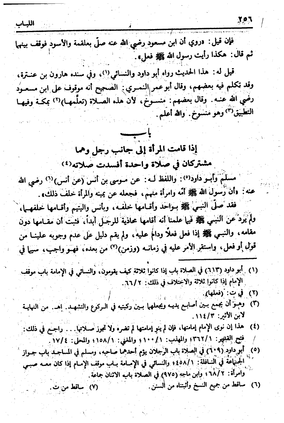 فقد صلى النَّبِي [صلى الله عَلَيْهِ وَسلم] بِوَاحِد وأقامها خَلفه، وبأنس واليتيم وأقامها خلفهمَا، وَلم يرد عَن النَّبِي [صلى الله عَلَيْهِ وَسلم] فِيمَا علمنَا أَنه أَقَامَهَا محاذية للرجل أبدا، فَثَبت أَن مقَامهَا دون مقَامه، وَالنَّبِيّ [صلى الله عَلَيْهِ وَسلم] إِذا فعل فعلا ودام عَلَيْهِ، وَلم يقم دَلِيل على عدم وُجُوبه علينا من قَول أَو فعل، وَاسْتقر الْأَمر عَلَيْهِ فِي زَمَانه (وزمن) من بعده، فَهُوَ وَاجِب، سِيمَا فِي