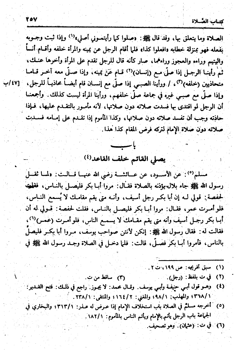مُسلم: عَن الْأسود، عَن عَائِشَة رَضِي الله عَنْهَا قَالَت: " لما ثقل رَسُول الله [صلى الله عَلَيْهِ وَسلم] جَاءَ بِلَال يُؤذنهُ بِالصَّلَاةِ فَقَالَ: مروا أَبَا بكر فَليصل بِالنَّاسِ، فَقلت لحفصة: قولي لَهُ إِن أَبَا بكر رجل أسيف، وَأَنه مَتى يقم مقامك لَا يسمع النَّاس، فَلَو أمرت عمر، فَقَالَ: مروا أَبَا بكر فَليصل بِالنَّاسِ، فَقلت لحفصة: قولي لَهُ أَن أَبَا بكر رجل أسيف وَأَنه مَتى يقم مقامك لَا يسمع النَّاس، فَلَو أمرت (عمر) ، فَقَالَت لَهُ: فَقَالَ رَسُول الله [صلى الله عَلَيْهِ وَسلم] : إنكن لأنتن صَوَاحِب يُوسُف، مروا أَبَا بكر فَليصل بِالنَّاسِ، فَأمروا أَبَا بكر فصلى، قَالَت: فَلَمَّا دخل فِي الصَّلَاة وجد رَسُول الله [صلى الله عَلَيْهِ وَسلم] فِي