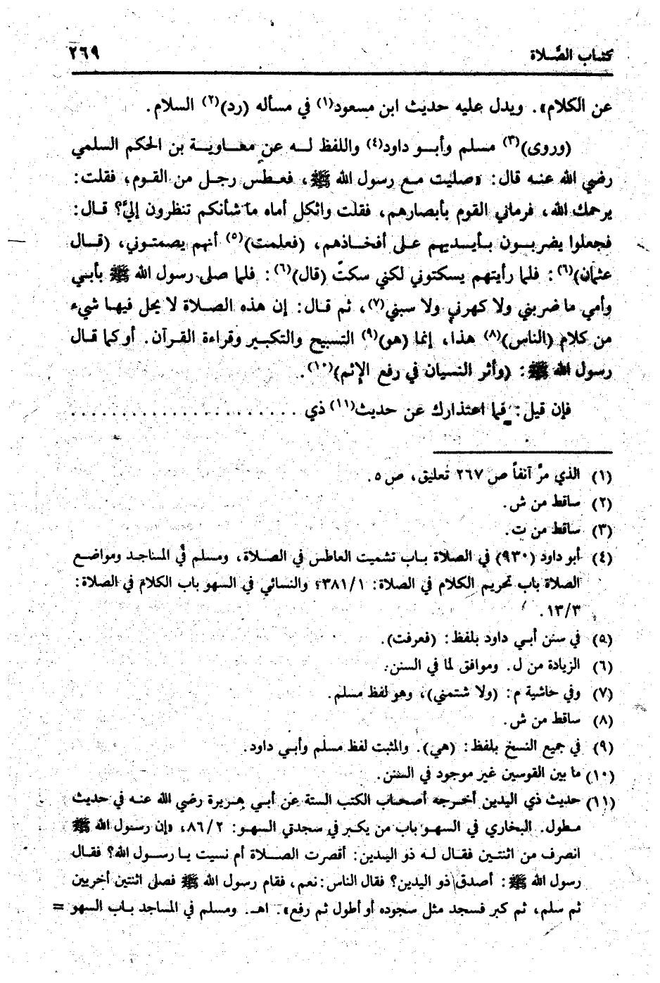(وروى) مُسلم وَأَبُو دَاوُد وَاللَّفْظ لَهُ عَن مُعَاوِيَة بن الحكم السّلمِيّ رَضِي الله عَنهُ قَالَ: " صليت مَعَ رَسُول الله [صلى الله عَلَيْهِ وَسلم] ، فعطس رجل من الْقَوْم، فَقلت: يَرْحَمك الله، فَرَمَانِي الْقَوْم بِأَبْصَارِهِمْ، فَقلت واثكل أُمَّاهُ مَا شَأْنكُمْ تنْظرُون إِلَيّ؟ قَالَ: فَجعلُوا يضْربُونَ بِأَيْدِيهِم على أَفْخَاذهم، (فَعلمت) أَنهم يُصمتُونِي، (قَالَ عُثْمَان) : فَلَمَّا رَأَيْتهمْ يسكتوني لكني سكت (قَالَ) : فَلَمَّا صلى رَسُول الله [صلى الله عَلَيْهِ وَسلم] بِأبي وَأمي مَا ضَرَبَنِي وَلَا كَهَرَنِي وَلَا سبني، ثمَّ قَالَ: إِن هَذِه الصَّلَاة لَا يحل فِيهَا شَيْء من كَلَام (النَّاس) هَذَا، إِنَّمَا (هُوَ) التَّسْبِيح وَالتَّكْبِير وَقِرَاءَة الْقُرْآن. أَو كَمَا قَالَ رَسُول الله [صلى الله عَلَيْهِ وَسلم] : (وَأثر النسْيَان فِي رفع الْإِثْم) .