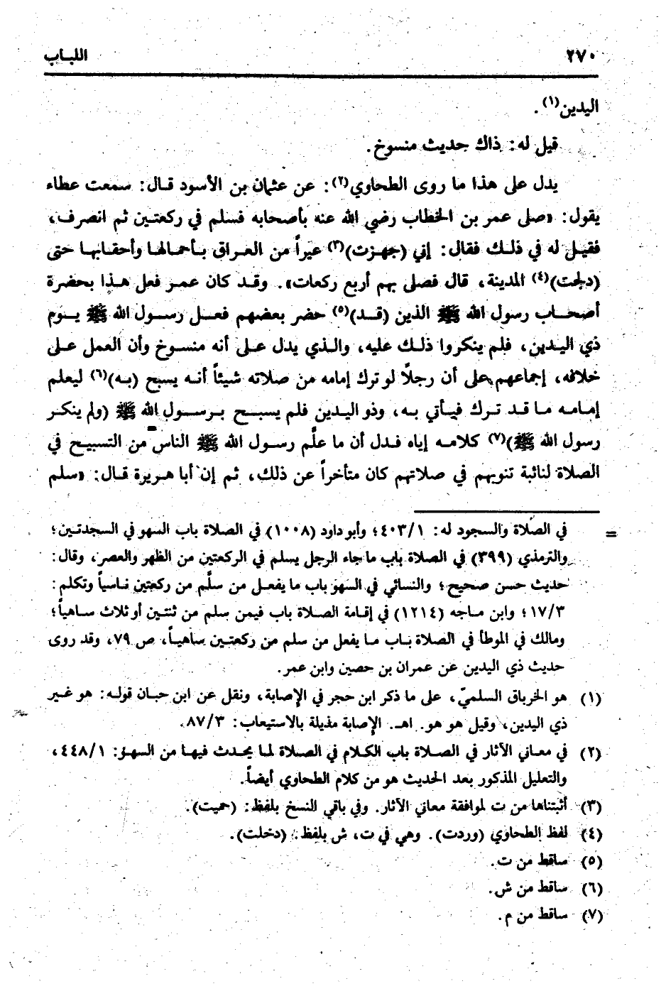 يدل على هَذَا مَا روى الطَّحَاوِيّ: عَن عُثْمَان بن الْأسود قَالَ: سَمِعت عَطاء يَقُول: " صلى عمر بن الْخطاب رَضِي الله عَنهُ بِأَصْحَابِهِ فَسلم فِي رَكْعَتَيْنِ ثمَّ انْصَرف، فَقيل لَهُ فِي ذَلِك فَقَالَ: إِنِّي (جهزت) عيرًا من الْعرَاق بأحمالها وأحقابها حَتَّى (دلجت) الْمَدِينَة، قَالَ فصلى بهم أَربع رَكْعَات ". وَقد كَانَ عمر فعل هَذَا بِحَضْرَة أَصْحَاب رَسُول الله [صلى الله عَلَيْهِ وَسلم] الَّذين (قد) حضر بَعضهم فعل رَسُول الله [صلى الله عَلَيْهِ وَسلم] يَوْم ذِي الْيَدَيْنِ، فَلم ينكروا ذَلِك عَلَيْهِ، وَالَّذِي يدل على أَنه مَنْسُوخ وَأَن الْعَمَل على خِلَافه، إِجْمَاعهم على أَن رجلا لَو ترك إِمَامه من صلَاته شَيْئا أَنه يسبح (بِهِ) ليعلم إِمَامه مَا قد ترك فَيَأْتِي بِهِ، وَذُو الْيَدَيْنِ فَلم يسبح برَسُول الله [صلى الله عَلَيْهِ وَسلم] (وَلم يُنكر رَسُول الله [صلى الله عَلَيْهِ وَسلم] ) كَلَامه إِيَّاه فَدلَّ أَن مَا علم رَسُول الله [صلى الله عَلَيْهِ وَسلم] النَّاس من التَّسْبِيح فِي الصَّلَاة لنائبة تنوبهم فِي صلَاتهم كَانَ مُتَأَخِّرًا عَن ذَلِك، ثمَّ إِن أَبَا هُرَيْرَة قَالَ: " سلم