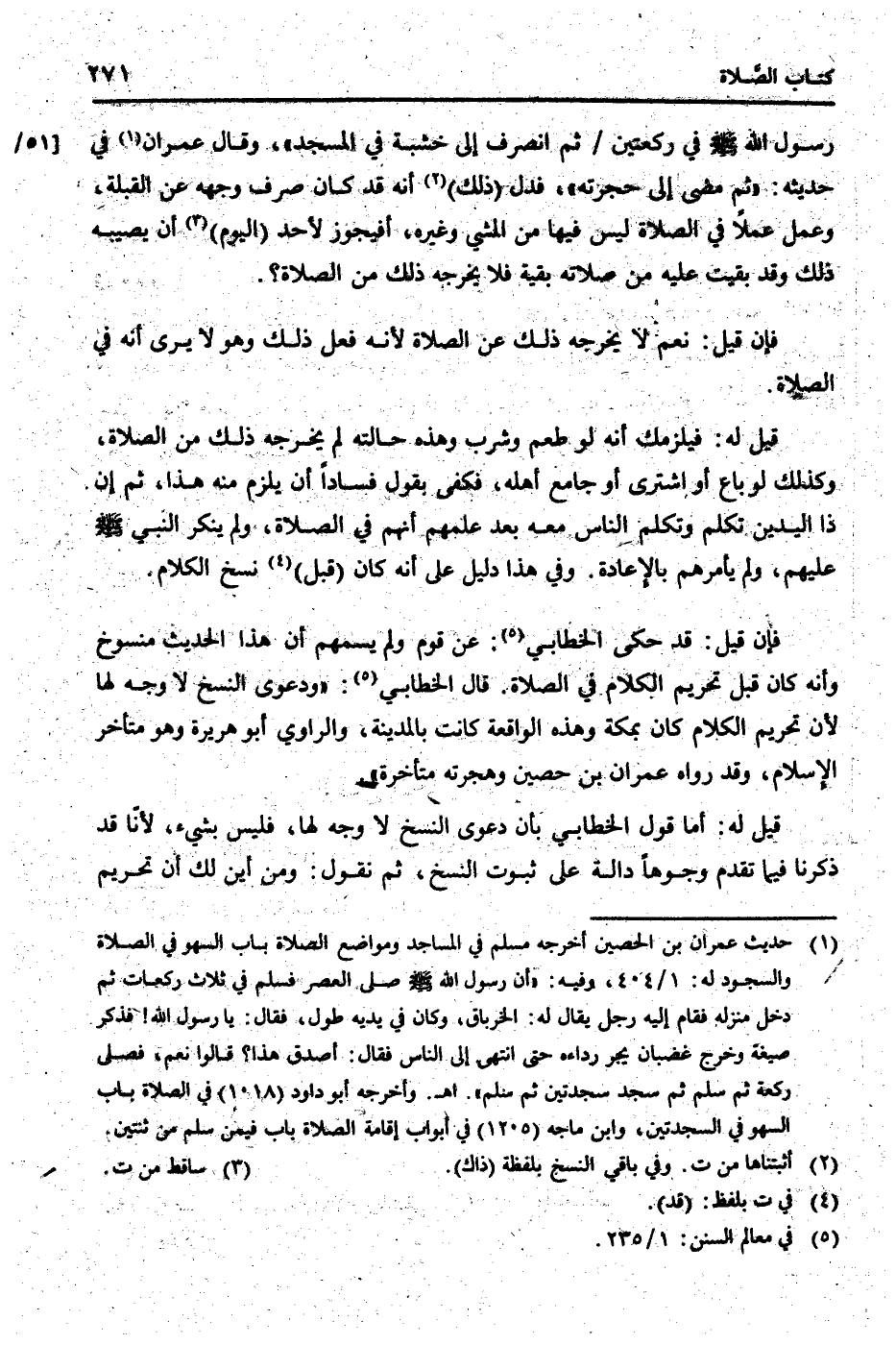 قيل لَهُ: فيلزمك أَنه لَو طعم وَشرب وَهَذِه حَالَته لم يُخرجهُ ذَلِك من الصَّلَاة، وَكَذَلِكَ لَو بَاعَ أَو اشْترى أَو جَامع أَهله، فَكفى بقول فَسَادًا أَن يلْزم مِنْهُ هَذَا، ثمَّ إِن ذَا الْيَدَيْنِ تكلم وَتكلم النَّاس مَعَه بعد علمهمْ أَنهم فِي الصَّلَاة، وَلم يُنكر النَّبِي [صلى الله عَلَيْهِ وَسلم] عَلَيْهِم، وَلم يَأْمُرهُم بِالْإِعَادَةِ. وَفِي هَذَا دَلِيل على أَنه كَانَ (قبل) نسخ الْكَلَام.