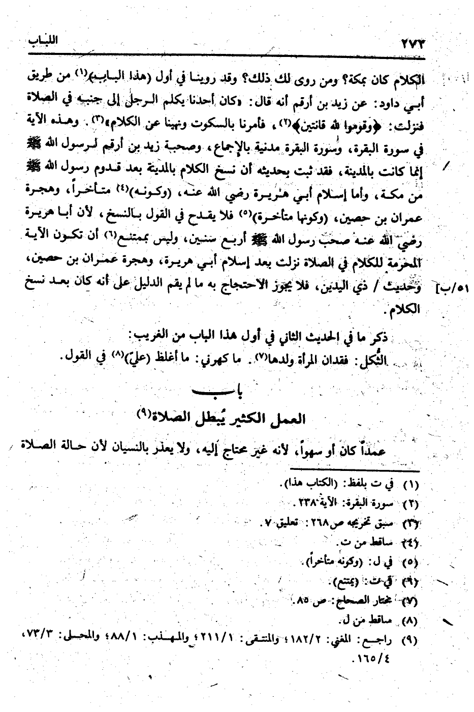 الْكَلَام كَانَ بِمَكَّة؟ وَمن روى لَك ذَلِك وَقد روينَا فِي أول (هَذَا الْبَاب) من طَرِيق أبي دَاوُد: عَن زيد بن أَرقم أَنه قَالَ: " كَانَ أَحَدنَا يكلم الرجل إِلَى جنبه فِي الصَّلَاة فَنزلت: {وَقومُوا لله قَانِتِينَ} ، فَأمرنَا بِالسُّكُوتِ ونهينا عَن الْكَلَام ". وَهَذِه الْآيَة فِي سُورَة الْبَقَرَة، وَسورَة الْبَقَرَة مَدَنِيَّة بِالْإِجْمَاع، وصحبة زيد بن أَرقم لرَسُول الله [صلى الله عَلَيْهِ وَسلم] إِنَّمَا كَانَت بِالْمَدِينَةِ، فقد ثَبت بحَديثه أَن نسخ الْكَلَام بِالْمَدِينَةِ بعد قدوم رَسُول الله [صلى الله عَلَيْهِ وَسلم] من مَكَّة، وَأما إِسْلَام أبي هُرَيْرَة رَضِي الله عَنهُ، (وَكَونه) مُتَأَخِّرًا، وهجرة عمرَان بن حُصَيْن، (وَكَونهَا مُتَأَخِّرَة) فَلَا يقْدَح فِي القَوْل بالنسخ، لِأَن أَبَا هُرَيْرَة رَضِي الله عَنهُ صحب رَسُول الله [صلى الله عَلَيْهِ وَسلم] أَربع سِنِين، وَلَيْسَ بممتنع أَن تكون الْآيَة الْمُحرمَة للْكَلَام فِي الصَّلَاة نزلت بعد إِسْلَام أبي هُرَيْرَة، وهجرة عمرَان بن حُصَيْن، وَحَدِيث / ذِي الْيَدَيْنِ، فَلَا يجوز الِاحْتِجَاج بِهِ مَا لم يقم الدَّلِيل على أَنه كَانَ بعد نسخ الْكَلَام.