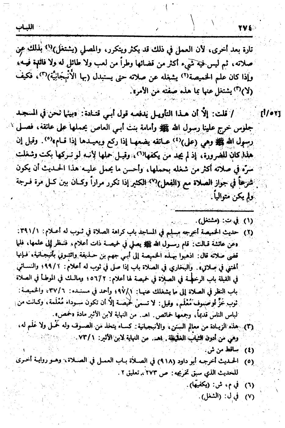 تَارَة بعد أُخْرَى، لِأَن الْعَمَل فِي ذَلِك قد يكثر ويتكرر، وَالْمُصَلي (يشْتَغل) بذلك عَن صلَاته، ثمَّ لَيْسَ فِيهِ شَيْء أَكثر من قَضَائهَا وطراً من لعب وَلَا طائل لَهُ وَلَا فَائِدَة فِيهِ، وَإِذا كَانَ علم الخميصة يشْغلهُ عَن صلَاته حَتَّى يسْتَبْدل (بهَا الأنبجانية) ، فَكيف (لَا) يشْتَغل عَنْهَا بِمَا هَذِه صفته من الْأَمر ".