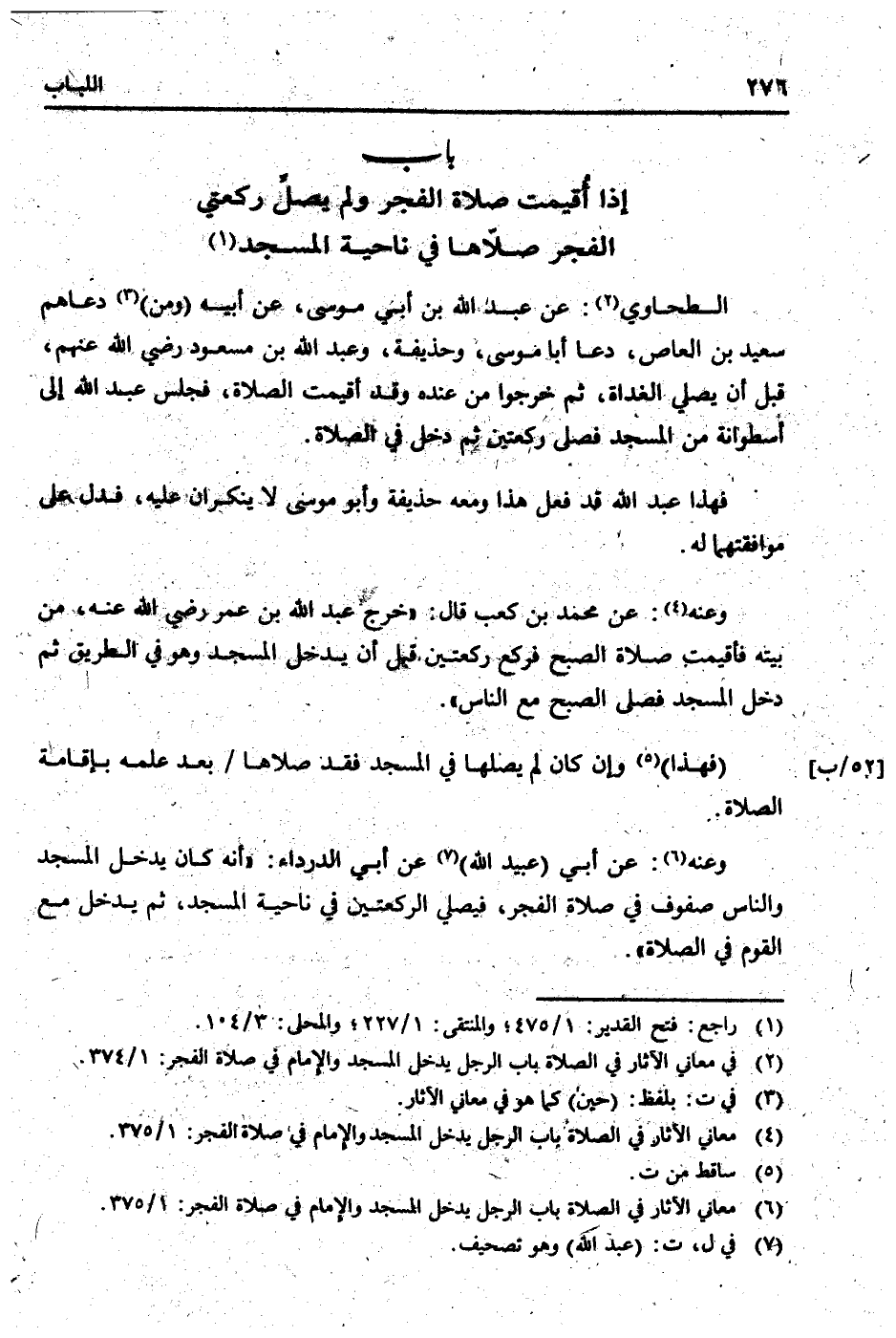 الطَّحَاوِيّ: عَن عبد الله بن أبي مُوسَى، عَن أَبِيه (وَمن) دعاهم سعيد بن الْعَاصِ، دَعَا أَبَا مُوسَى، وَحُذَيْفَة، وَعبد الله بن مَسْعُود رَضِي الله عَنْهُم، قبل أَن يُصَلِّي الْغَدَاة، ثمَّ خَرجُوا من عِنْده وَقد أُقِيمَت الصَّلَاة، فَجَلَسَ عبد الله إِلَى أسطوانة من الْمَسْجِد فصلى رَكْعَتَيْنِ ثمَّ دخل فِي الصَّلَاة.