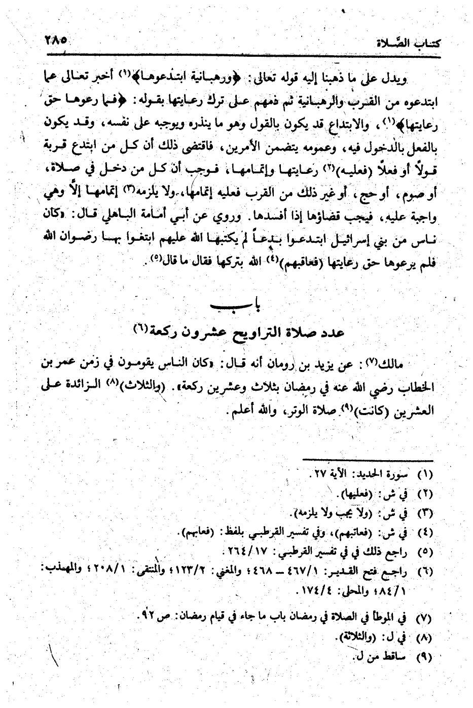 " وَيدل على مَا ذَهَبْنَا إِلَيْهِ قَوْله تَعَالَى: {ورهبانية ابتدعوها} أخبر تَعَالَى عَمَّا ابتدعوه من الْقرب والرهبانية ثمَّ ذمهم على ترك رعايتها بقوله: {فَمَا رعوها حق رعايتها} ، والابتداع قد يكون بالْقَوْل وَهُوَ مَا ينذره ويوجبه على نَفسه، وَقد يكون بِالْفِعْلِ بِالدُّخُولِ فِيهِ، وعمومه يتَضَمَّن الْأَمريْنِ، فَاقْتضى ذَلِك أَن كل من ابتدع قربَة قولا أَو فعلا (فَعَلَيهِ) رعايتها وإتمامها، فَوَجَبَ أَن كل من دخل فِي صَلَاة، أَو صَوْم، أَو حج، أَو غير ذَلِك من الْقرب فَعَلَيهِ إِتْمَامهَا، وَلَا يلْزمه إِتْمَامهَا إِلَّا وَهِي وَاجِبَة عَلَيْهِ، فَيجب قَضَاؤُهَا إِذا أفسدها. وَرُوِيَ عَن أبي أُمَامَة الْبَاهِلِيّ قَالَ: " كَانَ نَاس من بني إِسْرَائِيل ابتدعوا بدعا لم يَكْتُبهَا الله عَلَيْهِم ابْتَغوا بهَا رضوَان الله فَلم يرعوها حق رعايتها (فعاقبهم) الله بِتَرْكِهَا فَقَالَ مَا قَالَ.
