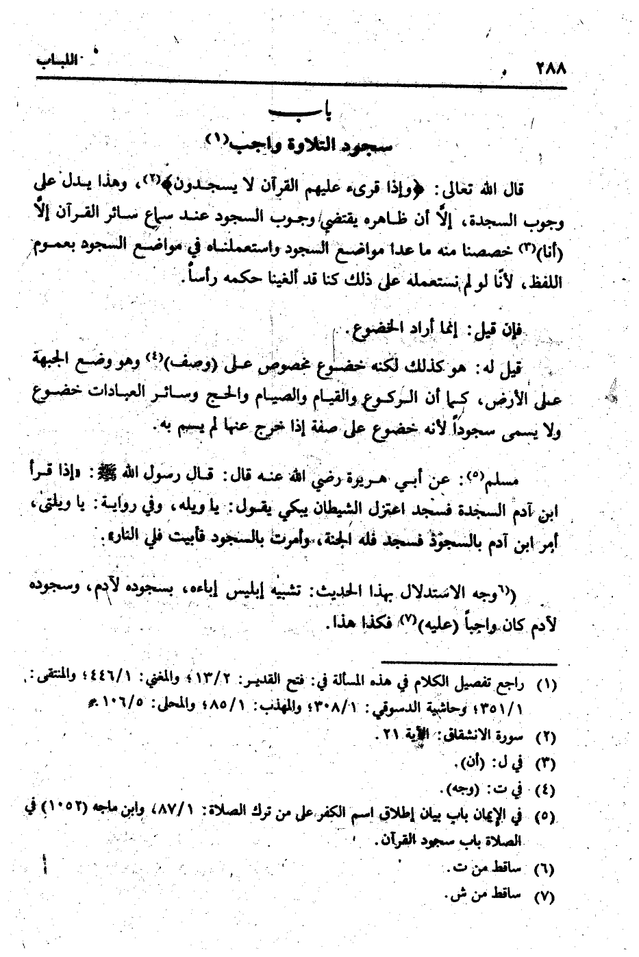 مُسلم: عَن أبي هُرَيْرَة رَضِي الله عَنهُ قَالَ: قَالَ رَسُول الله [صلى الله عَلَيْهِ وَسلم] : " إِذا قَرَأَ ابْن آدم السَّجْدَة فَسجدَ اعتزل الشَّيْطَان يبكي يَقُول: يَا ويله، وَفِي رِوَايَة: يَا ويلتى، أَمر ابْن آدم بِالسُّجُود فَسجدَ فَلهُ الْجنَّة، وَأمرت بِالسُّجُود فأبيت فلي النَّار ".