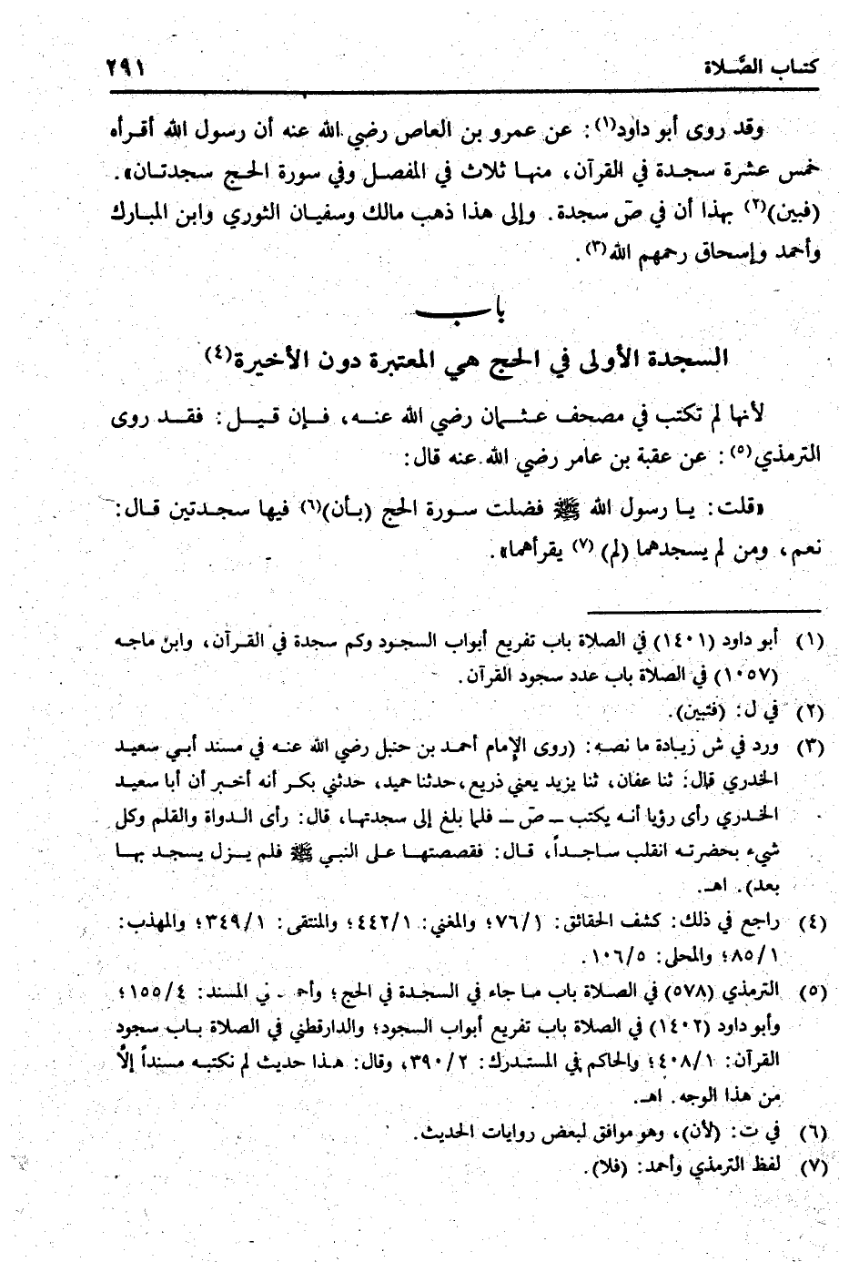 " قلت: يَا رَسُول الله [صلى الله عَلَيْهِ وَسلم] فضلت سُورَة الْحَج (بِأَن) فِيهَا سَجْدَتَيْنِ قَالَ: نعم، وَمن لم يسجدهما (لم) يقرأهما ".