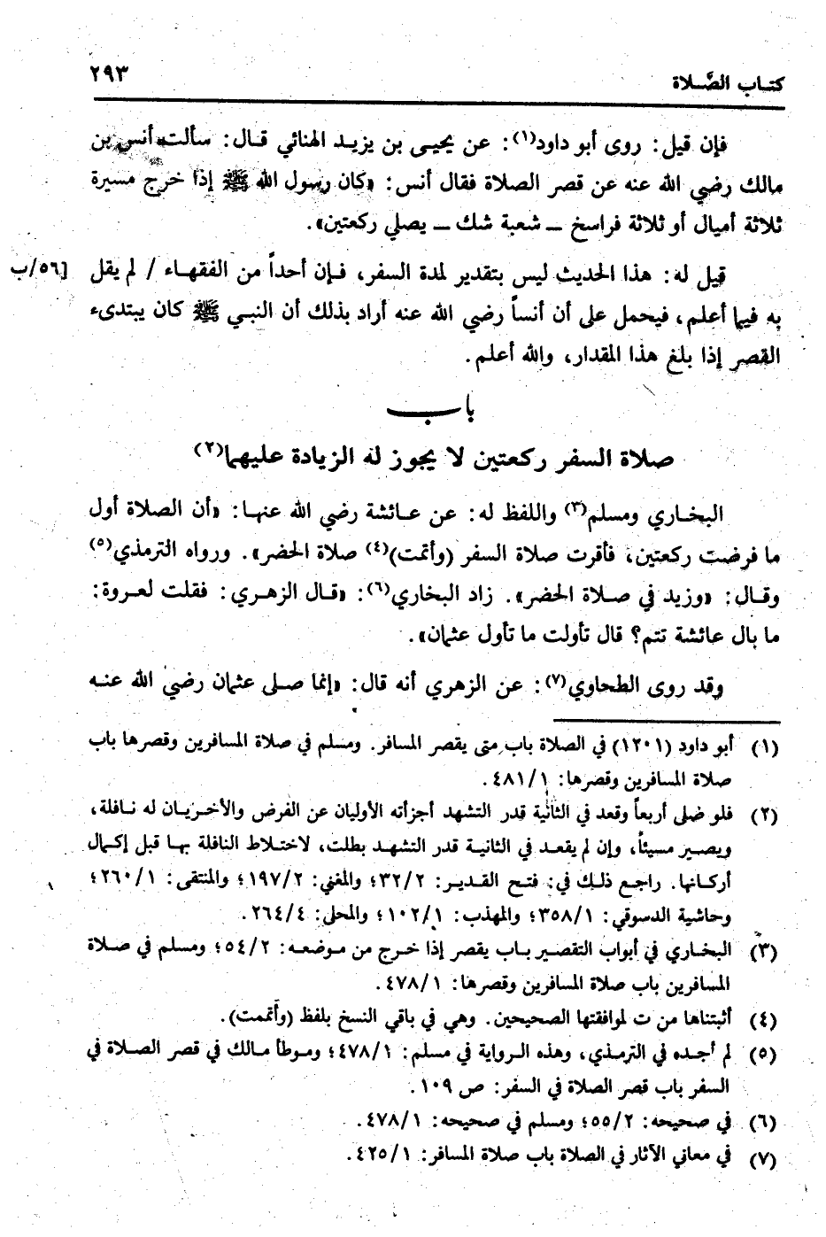 البُخَارِيّ وَمُسلم وَاللَّفْظ لَهُ: عَن عَائِشَة رَضِي الله عَنْهَا: " أَن الصَّلَاة أول مَا فرضت رَكْعَتَيْنِ، فأقرت صَلَاة السّفر (وأتمت) صَلَاة الْحَضَر ". وَرَوَاهُ التِّرْمِذِيّ وَقَالَ: " وَزيد فِي صَلَاة الْحَضَر ". زَاد البُخَارِيّ: " قَالَ الزُّهْرِيّ: فَقلت لعروة: مَا بَال عَائِشَة تتمّ؟ قَالَ تأولت مَا تَأَول عُثْمَان ".