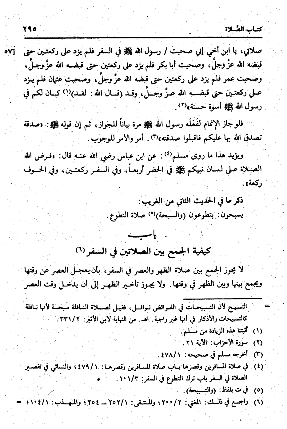 صَلَاتي، يَا ابْن أخي إِنِّي صَحِبت / رَسُول الله [صلى الله عَلَيْهِ وَسلم] فِي السّفر فَلم يزدْ على رَكْعَتَيْنِ حَتَّى قَبضه الله عز وَجل، وصحبت أَبَا بكر فَلم يزدْ على رَكْعَتَيْنِ حَتَّى قَبضه الله عز وَجل، وصحبت عمر فَلم يزدْ على رَكْعَتَيْنِ حَتَّى قَبضه الله عز وَجل، وصحبت عُثْمَان فَلم يزدْ على رَكْعَتَيْنِ حَتَّى قَبضه الله عز وَجل، وَقد (قَالَ الله: لقد) كَانَ لكم فِي رَسُول الله [صلى الله عَلَيْهِ وَسلم] أُسْوَة حَسَنَة ".