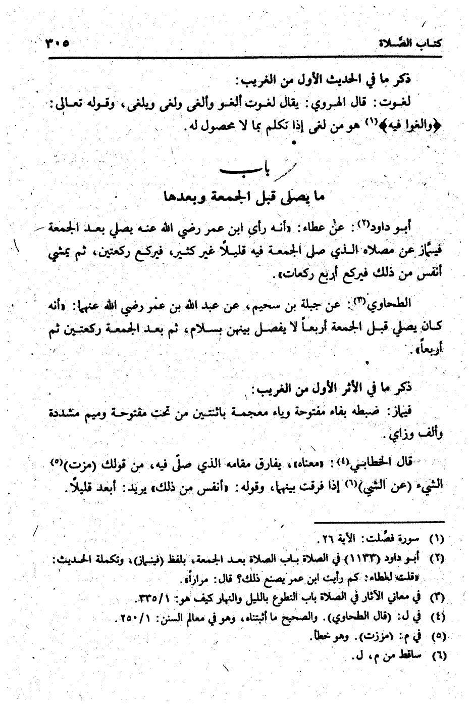 الطَّحَاوِيّ: عَن جبلة بن سحيم، عَن عبد الله بن عمر رَضِي الله عَنْهُمَا: " أَنه كَانَ يُصَلِّي قبل الْجُمُعَة أَرْبعا لَا يفصل بَينهُنَّ بِسَلام، ثمَّ بعد الْجُمُعَة رَكْعَتَيْنِ ثمَّ أَرْبعا ".
