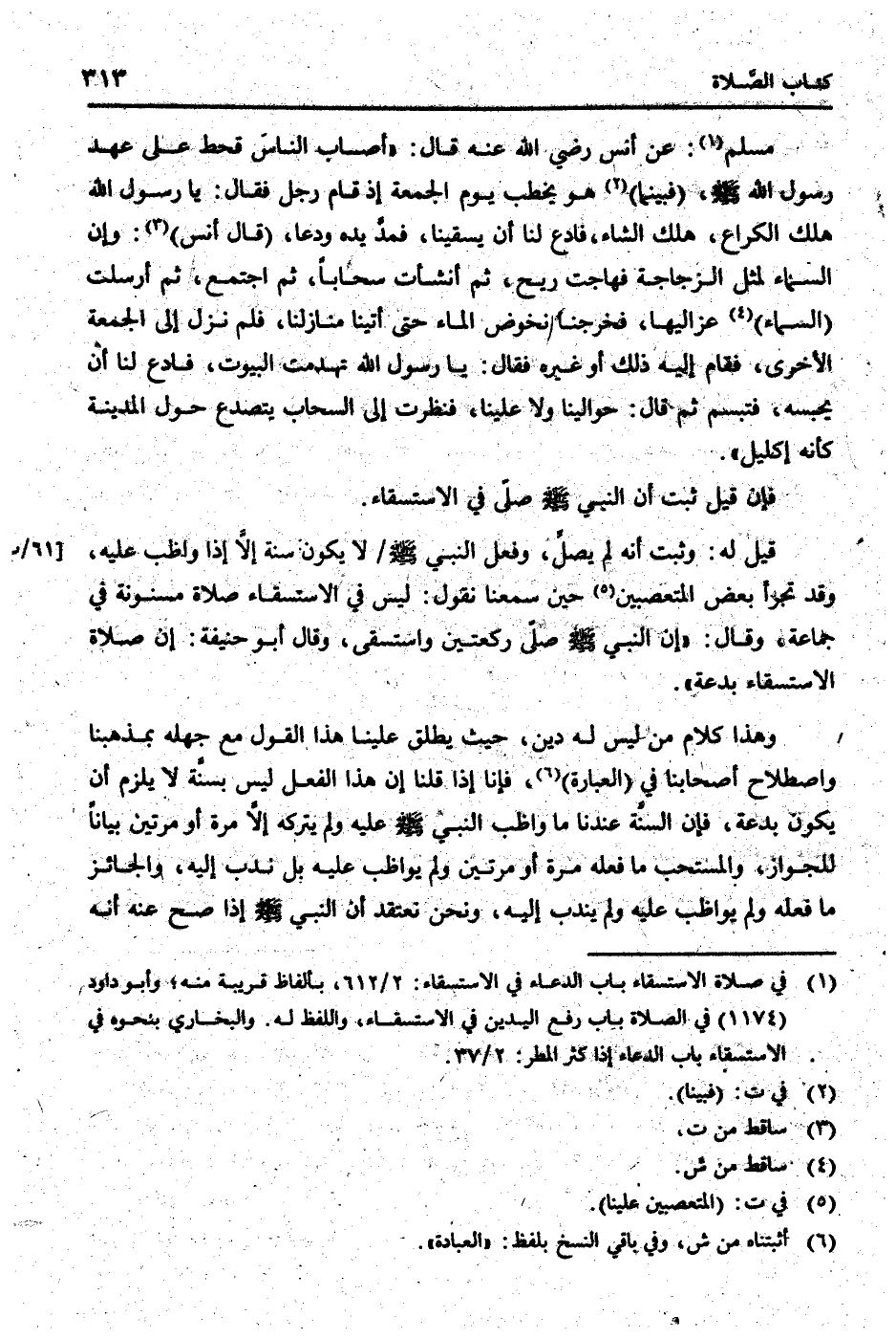 فَإِن قيل ثَبت أَن النَّبِي [صلى الله عَلَيْهِ وَسلم] صلى فِي الاسْتِسْقَاء. " قيل لَهُ: وَثَبت أَنه لم يصل، وَفعل النَّبِي [صلى الله عَلَيْهِ وَسلم] / لَا يكون سنة إِلَّا إِذا واظب عَلَيْهِ، وَقد تجرأ بعض المتعصبين حِين سمعنَا نقُول: لَيْسَ فِي الاسْتِسْقَاء صَلَاة مسنونة فِي جمَاعَة، وَقَالَ: " إِن النَّبِي [صلى الله عَلَيْهِ وَسلم] صلى رَكْعَتَيْنِ واستسقى، وَقَالَ أَبُو حنيفَة: إِن صَلَاة الاسْتِسْقَاء بِدعَة ".