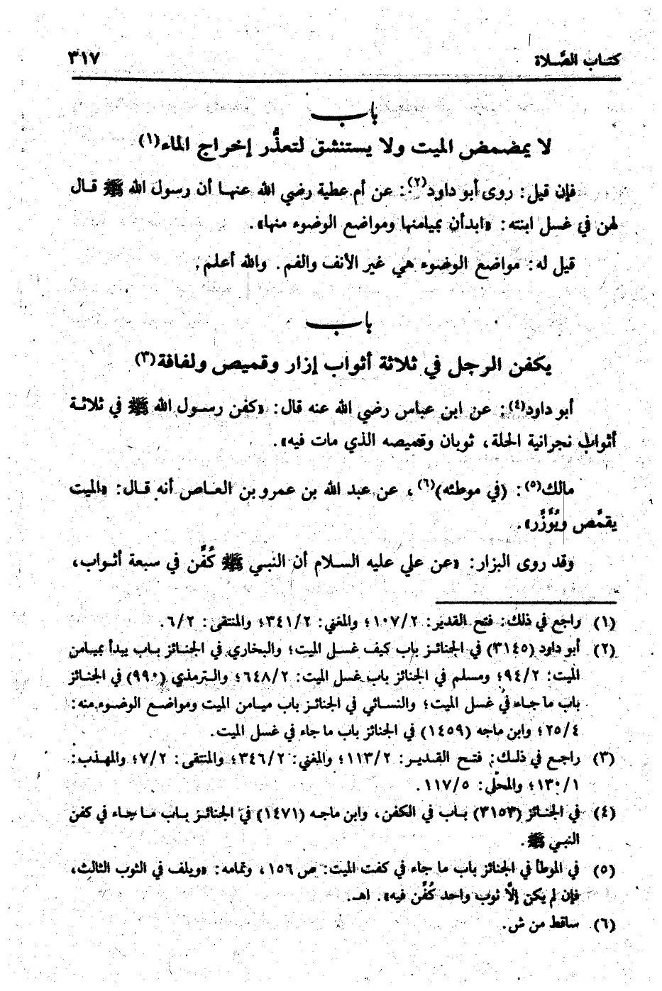 أَبُو دَاوُد: عَن ابْن عَبَّاس رَضِي الله عَنهُ قَالَ: " كفن رَسُول الله [صلى الله عَلَيْهِ وَسلم] فِي ثَلَاثَة أَثوَاب نجرانية الْحلَّة، ثَوْبَان وقميصه الَّذِي مَاتَ فِيهِ ".