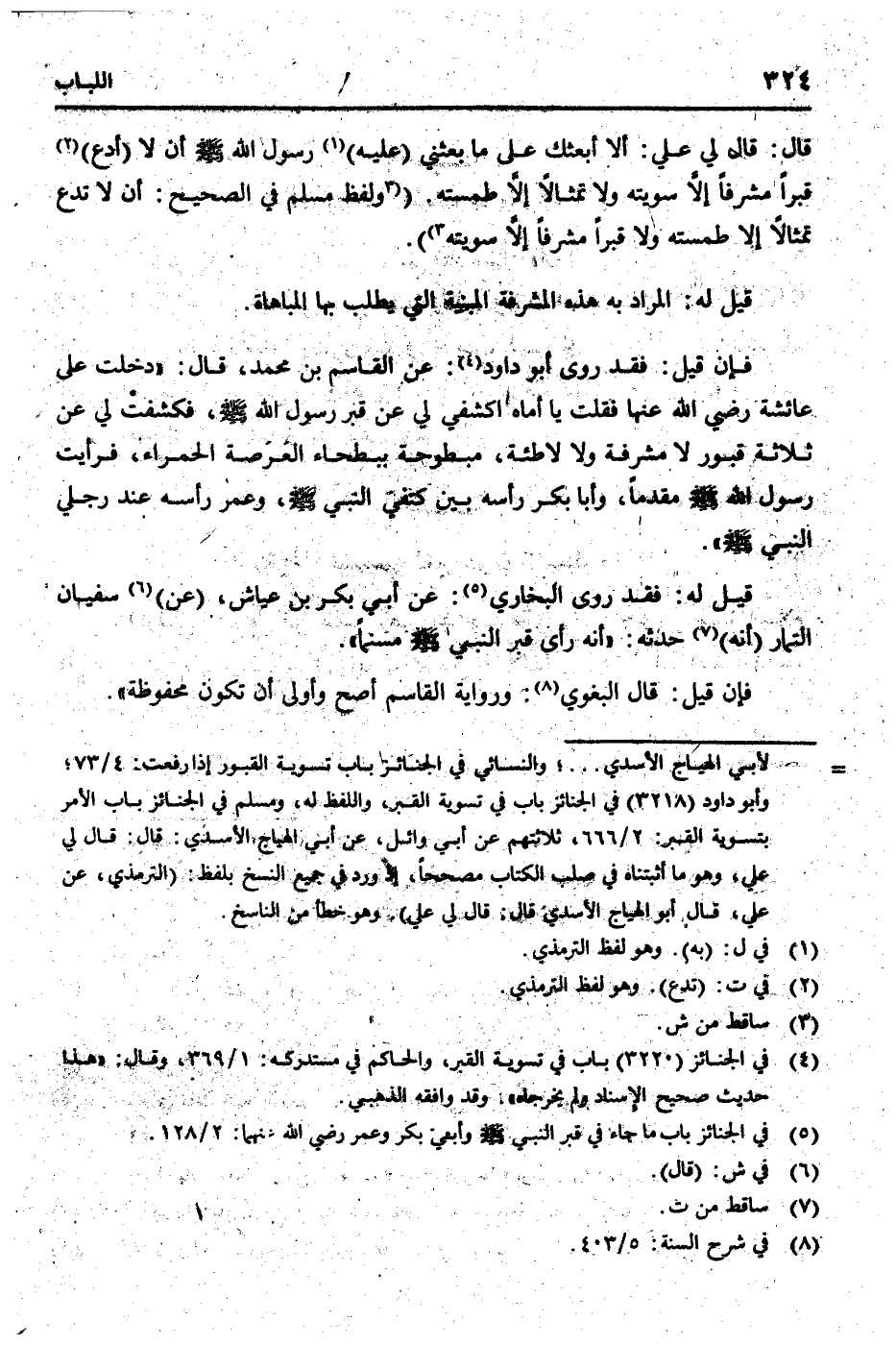 قَالَ: قَالَ لي عَليّ: أَلا أَبْعَثك على مَا بَعَثَنِي (عَلَيْهِ) رَسُول الله [صلى الله عَلَيْهِ وَسلم] أَن لَا (أدع) قبرا مشرفا إِلَّا سويته وَلَا تمثالا إِلَّا طمسته. (وَلَفظ مُسلم فِي الصَّحِيح: أَن لَا تدع تمثالا إِلَّا طمسته وَلَا قبرا مشرفا إِلَّا سويته) .