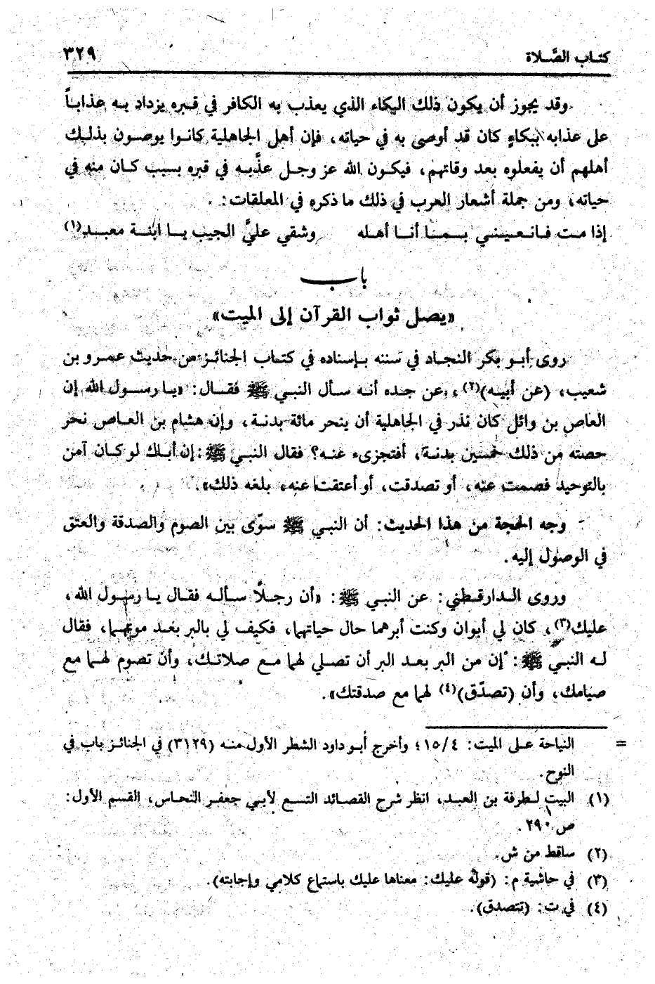 روى أَبُو بكر النجاد فِي سنَنه بِإِسْنَادِهِ فِي كتاب الْجَنَائِز من حَدِيث عَمْرو بن شُعَيْب، (عَن أَبِيه) ، عَن جده أَنه سَأَلَ النَّبِي [صلى الله عَلَيْهِ وَسلم] فَقَالَ: " يَا رَسُول الله إِن الْعَاصِ بن وَائِل كَانَ نذر فِي الْجَاهِلِيَّة أَن ينْحَر مائَة بَدَنَة، وَإِن هِشَام بن الْعَاصِ نحر حِصَّته من ذَلِك خمسين بَدَنَة، أفتجزئ عَنهُ؟ فَقَالَ النَّبِي [صلى الله عَلَيْهِ وَسلم] : إِن أَبَاك لَو كَانَ آمن بِالتَّوْحِيدِ فَصمت عَنهُ، أَو تَصَدَّقت، أَو أعتقت عَنهُ، بلغه ذَلِك ".