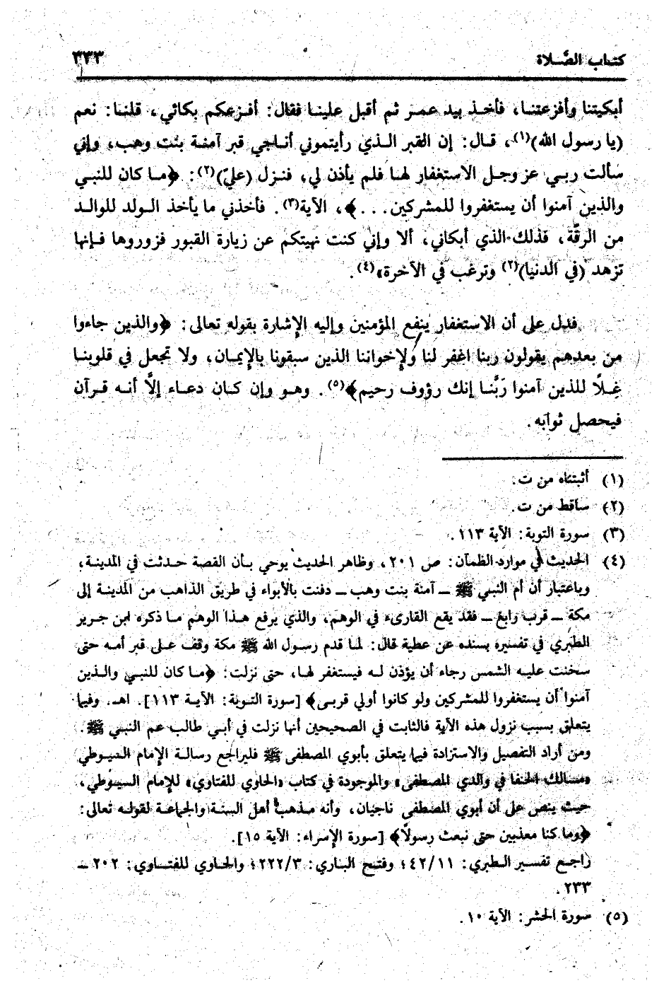 أبكيتنا وأفزعتنا، فَأخذ بيد عمر ثمَّ أقبل علينا فَقَالَ: أفزعكم بُكَائِي، قُلْنَا: نعم (يَا رَسُول الله) ، قَالَ: إِن الْقَبْر الَّذِي رَأَيْتُمُونِي أُنَاجِي قبر آمِنَة بنت وهب، وَإِنِّي سَأَلت رَبِّي عز وَجل الاسْتِغْفَار لَهَا فَلم يَأْذَن لي، فَنزل (عَليّ) : {مَا كَانَ للنَّبِي وَالَّذين آمنُوا أَن يَسْتَغْفِرُوا للْمُشْرِكين} ، الْآيَة. فأخذني مَا يَأْخُذ الْوَلَد للوالد من الرقة، فَذَلِك الَّذِي أبكاني، أَلا وَإِنِّي كنت نَهَيْتُكُمْ عَن زِيَارَة الْقُبُور فزوروها فَإِنَّهَا تزهد (فِي الدُّنْيَا) وترغب فِي الْآخِرَة ".