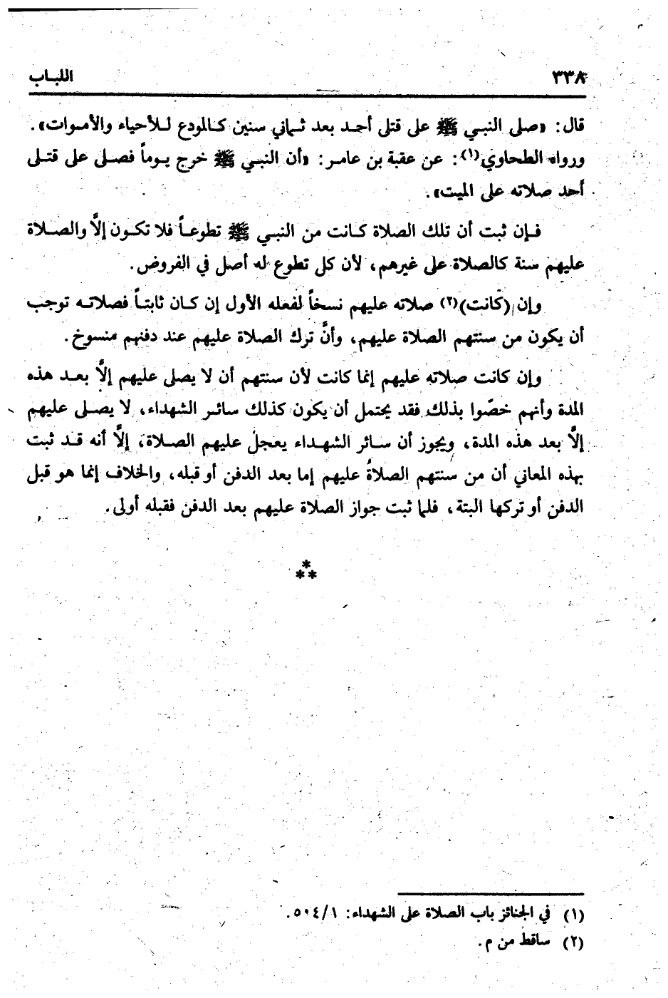 وَإِن (كَانَت) صلَاته عَلَيْهِم نسخا لفعله الأول إِن كَانَ ثَابتا فَصلَاته توجب أَن يكون من سنتهمْ الصَّلَاة عَلَيْهِم، وَأَن ترك الصَّلَاة عَلَيْهِم عِنْد دفنهم مَنْسُوخ.
