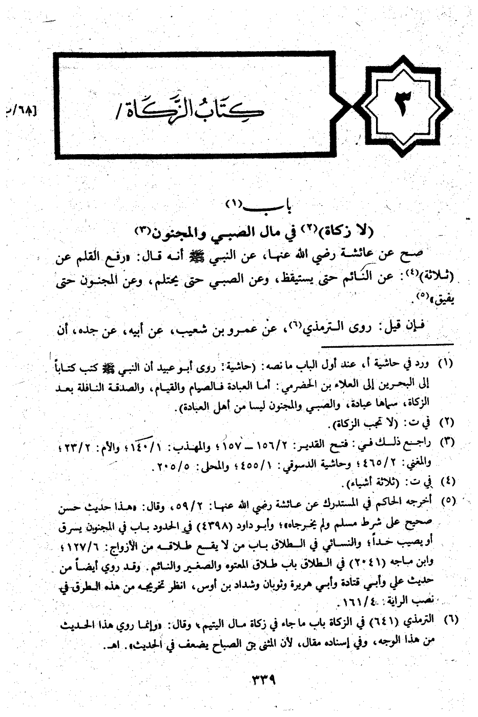 صَحَّ عَن عَائِشَة رَضِي الله عَنْهَا، عَن النَّبِي [صلى الله عَلَيْهِ وَسلم] أَنه قَالَ: " رفع الْقَلَم عَن (ثَلَاثَة) : عَن النَّائِم حَتَّى يَسْتَيْقِظ، وَعَن الصَّبِي حَتَّى يَحْتَلِم، وَعَن الْمَجْنُون حَتَّى يفِيق ".
