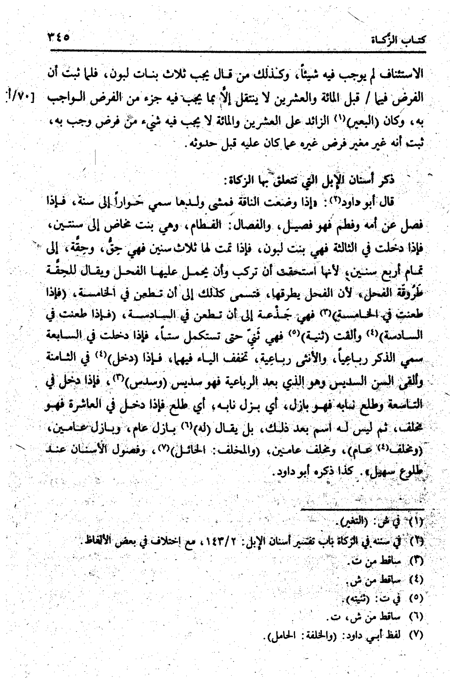 قَالَ أَبُو دَاوُد: " إِذا وضعت النَّاقة فَمشى وَلَدهَا سمي حوارا إِلَى سنة، فَإِذا فصل عَن أمه وفطم فَهُوَ فصيل، والفصال: الْفِطَام، وَهِي بنت مَخَاض إِلَى سنتَيْن، فَإِذا دخلت فِي الثَّالِثَة فَهِيَ بنت لبون، فَإِذا تمت لَهَا ثَلَاث سِنِين فَهِيَ حق، وحقة، إِلَى تَمام أَربع سِنِين، لِأَنَّهَا اسْتحقَّت أَن تركب وَأَن يحمل عَلَيْهَا الْفَحْل وَيُقَال للحقة طروقة الْفَحْل، لِأَن الْفَحْل يطرقها، فتسمى كَذَلِك إِلَى أَن تطعن فِي الْخَامِسَة، (فَإِذا طعنت فِي الْخَامِسَة) فَهِيَ جَذَعَة إِلَى أَن تطعن فِي السَّادِسَة، (فَإِذا طعنت فِي السَّادِسَة) وَأَلْقَتْ (ثنية) فَهِيَ ثني حَتَّى تستكمل سِتا، فَإِذا دخلت فِي السَّابِعَة سمي الذّكر رباعيا، وَالْأُنْثَى ربَاعِية، تخفف الْيَاء فيهمَا، فَإِذا (دخل) فِي الثَّامِنَة وَألقى السن السديس وَهُوَ الَّذِي بعد الرّبَاعِيّة فه سديس (وَسدس) ، فَإِذا دخل فِي التَّاسِعَة وطلع نابه فَهُوَ بازل، أَي بزل نابه، أَي طلع فَإِذا دخل فِي الْعَاشِرَة فَهُوَ مخلف، ثمَّ لَيْسَ لَهُ اسْم بعد ذَلِك، بل يُقَال (لَهُ) بازل عَام، وبازل عَاميْنِ، (ومخلف عَام) ، ومخلف عَاميْنِ، (والمخلف: الْحَائِل) ، وفصول الْأَسْنَان عِنْد طُلُوع سُهَيْل ". كَذَا ذكره أَبُو دواد.
