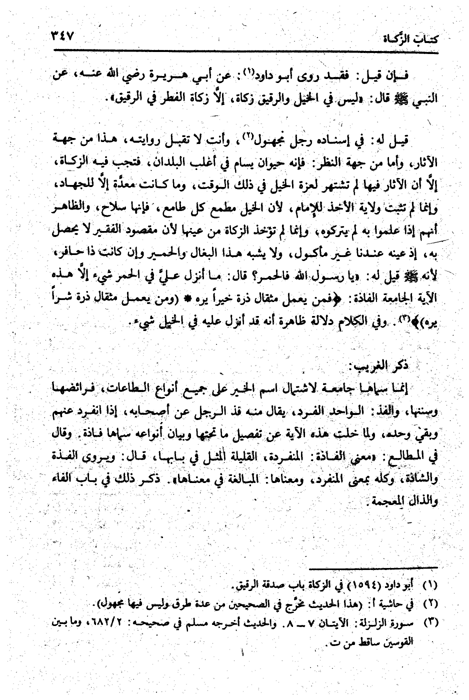 قيل لَهُ: فِي إِسْنَاده رجل مَجْهُول، وَأَنت لَا تقبل رِوَايَته، هَذَا من جِهَة الْآثَار، وَأما من جِهَة النّظر: فَإِنَّهُ حَيَوَان يسام فِي أغلب الْبلدَانِ، فَتجب فِيهِ الزَّكَاة، إِلَّا أَن الْآثَار فِيهَا لم تشتهر لعزة الْخَيل فِي ذَلِك الْوَقْت، وَمَا كَانَت معدة إِلَّا للْجِهَاد، وَإِنَّمَا لم تثبت ولَايَة الْأَخْذ للْإِمَام، لِأَن الْخَيل مطمع كل طامع، فَإِنَّهَا سلَاح، وَالظَّاهِر أَنهم إِذا علمُوا بِهِ لم يَتْرُكُوهُ، وَإِنَّمَا لم تُؤْخَذ الزَّكَاة من عينهَا لِأَن مَقْصُود الْفَقِير لَا يحصل بِهِ، إِذْ عينه عندنَا غير مَأْكُول، وَلَا يشبه هَذَا البغال وَالْحمير وَإِن كَانَت ذَا حافر، لِأَنَّهُ [صلى الله عَلَيْهِ وَسلم] قيل لَهُ: " يَا رَسُول الله فالحمر؟ قَالَ: مَا أنزل عَليّ فِي الْحمر شَيْء إِلَّا هَذِه الْآيَة الجامعة الفاذة: {فَمن يعْمل مِثْقَال ذرة خيرا يره وَمن يعْمل مِثْقَال ذرة شرا يره} . وَفِي الْكَلَام دلَالَة ظَاهِرَة أَنه قد أنزل عَلَيْهِ فِي الْخَيل شَيْء.