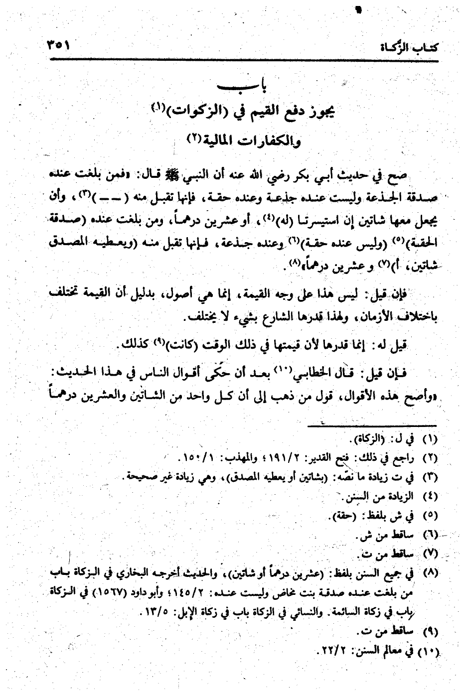 صَحَّ فِي حَدِيث أبي بكر رَضِي الله عَنهُ أَن النَّبِي [صلى الله عَلَيْهِ وَسلم] قَالَ: " فَمن بلغت عِنْده صَدَقَة الْجَذعَة وَلَيْسَت عِنْده جَذَعَة وَعِنْده حقة، فَإِنَّهَا تقبل مِنْهُ، وَأَن يَجْعَل مَعهَا شَاتين إِن استيسرتا (لَهُ) ، أَو عشْرين درهما، وَمن بلغت عِنْده (صَدَقَة الحقة) (وَلَيْسَ عِنْده حقة) وَعِنْده جَذَعَة، فَإِنَّهَا تقبل مِنْهُ (وَيُعْطِيه الْمُصدق شَاتين، أ) وَعشْرين درهما ".