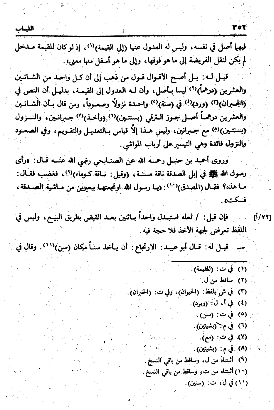 قيل لَهُ: بل أصح الْأَقْوَال قَول من ذهب إِلَى أَن كل وَاحِد من الشاتين وَالْعِشْرين (درهما) ليسَا بِأَصْل، وَأَن لَهُ الْعُدُول إِلَى الْقيمَة، بِدَلِيل أَن النَّص فِي (الْجبرَان) (ورد) فِي (سنة) وَاحِدَة نزولا وصعودا، وَمن قَالَ بِأَن الشاتين وَالْعِشْرين درهما أصل جوز الترقي (بِسنتَيْنِ) (وَأخذ) جبرانين، وَالنُّزُول (بِسنتَيْنِ) مَعَ جبرانين، وَلَيْسَ هَذَا إِلَّا قِيَاس بالتعديل والتقويم، وَفِي الصعُود وَالنُّزُول فَائِدَة وَهِي التَّيْسِير على أَرْبَاب الْمَوَاشِي.