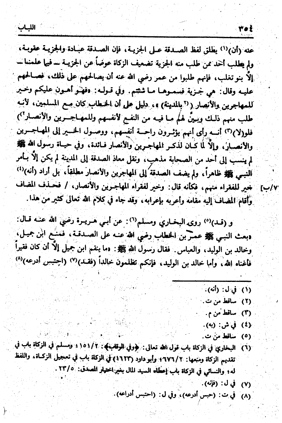 و (قد) روى البُخَارِيّ وَمُسلم: عَن أبي هُرَيْرَة رَضِي الله عَنهُ قَالَ: " بعث النَّبِي [صلى الله عَلَيْهِ وَسلم] عمر بن الْخطاب رَضِي الله عَنهُ على الصَّدَقَة، فَمنع ابْن جميل، وخَالِد بن الْوَلِيد، وَالْعَبَّاس. فَقَالَ رَسُول الله [صلى الله عَلَيْهِ وَسلم] : " مَا ينقم ابْن جميل إِلَّا أَن كَانَ فَقِيرا فأغناه الله، وَأما خَالِد بن الْوَلِيد، فَإِنَّكُم تظْلمُونَ خَالِدا (فقد) (احْتبسَ أدرعه)