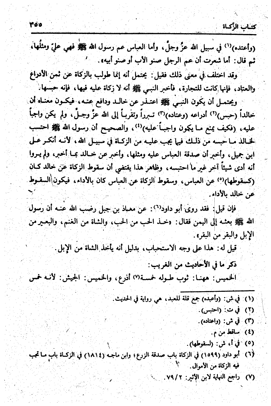 وَيحْتَمل أَن يكون النَّبِي [صلى الله عَلَيْهِ وَسلم] اعتذر عَن خَالِد ودوافع عَنهُ، فَيكون مَعْنَاهُ أَن خَالِدا (حبس) أدراعه (وعتاده) تبررا وتقربا إِلَى الله عز وَجل، وَلم يكن وَاجِبا عَلَيْهِ، (فَكيف يمْنَع مَا يكون وَاجِبا عَلَيْهِ) ، وَالصَّحِيح أَن رَسُول الله [صلى الله عَلَيْهِ وَسلم] احتسب لخَالِد مَا حَبسه من ذَلِك فِيمَا يجب عَلَيْهِ من الزَّكَاة فِي سَبِيل الله، لِأَنَّهُ أنكر على ابْن جميل، وَأخْبر أَن صَدَقَة الْعَبَّاس عَلَيْهِ وَمثلهَا، وَأخْبر عَن خَالِد بِمَا أخبر، وَلم يرَوا أَنه أدّى شَيْئا آخر غير مَا احتبسه، وَظَاهر هَذَا يَقْتَضِي أَن سُقُوط الزَّكَاة عَن خَالِد كَانَ (كسقوطها) عَن الْعَبَّاس، وَسُقُوط الزَّكَاة عَن الْعَبَّاس كَانَ بِالْأَدَاءِ، فَيكون السُّقُوط عَن خَالِد بِالْأَدَاءِ.
