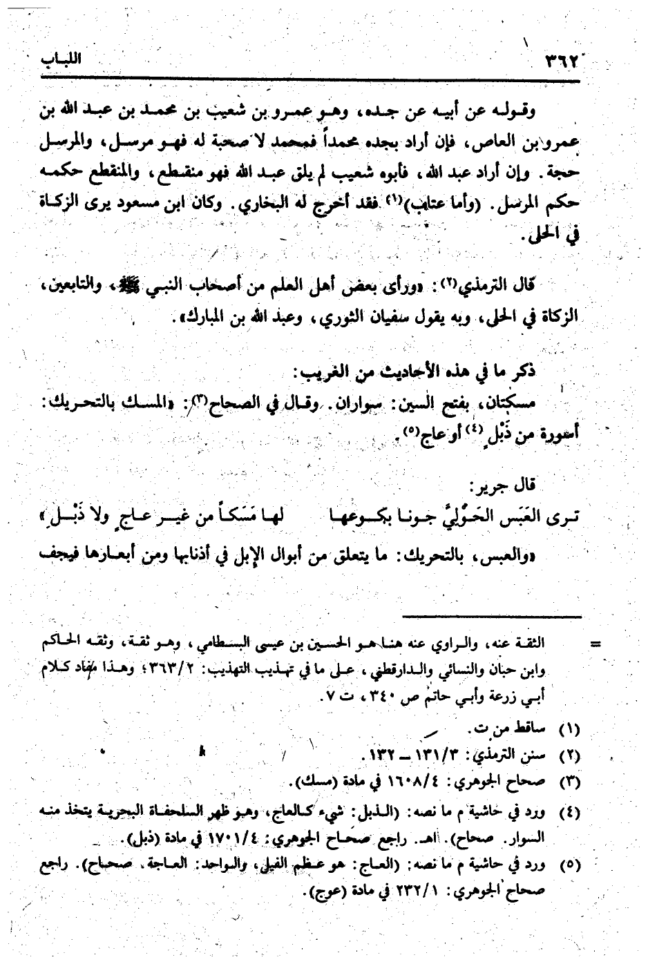 وَقَوله عَن أَبِيه عَن جده، وَهُوَ عَمْرو بن شُعَيْب بن مُحَمَّد بن عبد الله بن عَمْرو بن الْعَاصِ، فَإِن أَرَادَ بجده مُحَمَّدًا فمحمد لَا صُحْبَة لَهُ فَهُوَ مُرْسل، والمرسل حجَّة. وَإِن أَرَادَ عبد الله، فأبوه شُعَيْب لم يلق عبد الله فَهُوَ مُنْقَطع، والمنقطع حكمه حكم الْمُرْسل. (وَأما عتاب) فقد أخرج لَهُ البُخَارِيّ. وَكَانَ ابْن مَسْعُود يرى الزَّكَاة فِي الحلى.