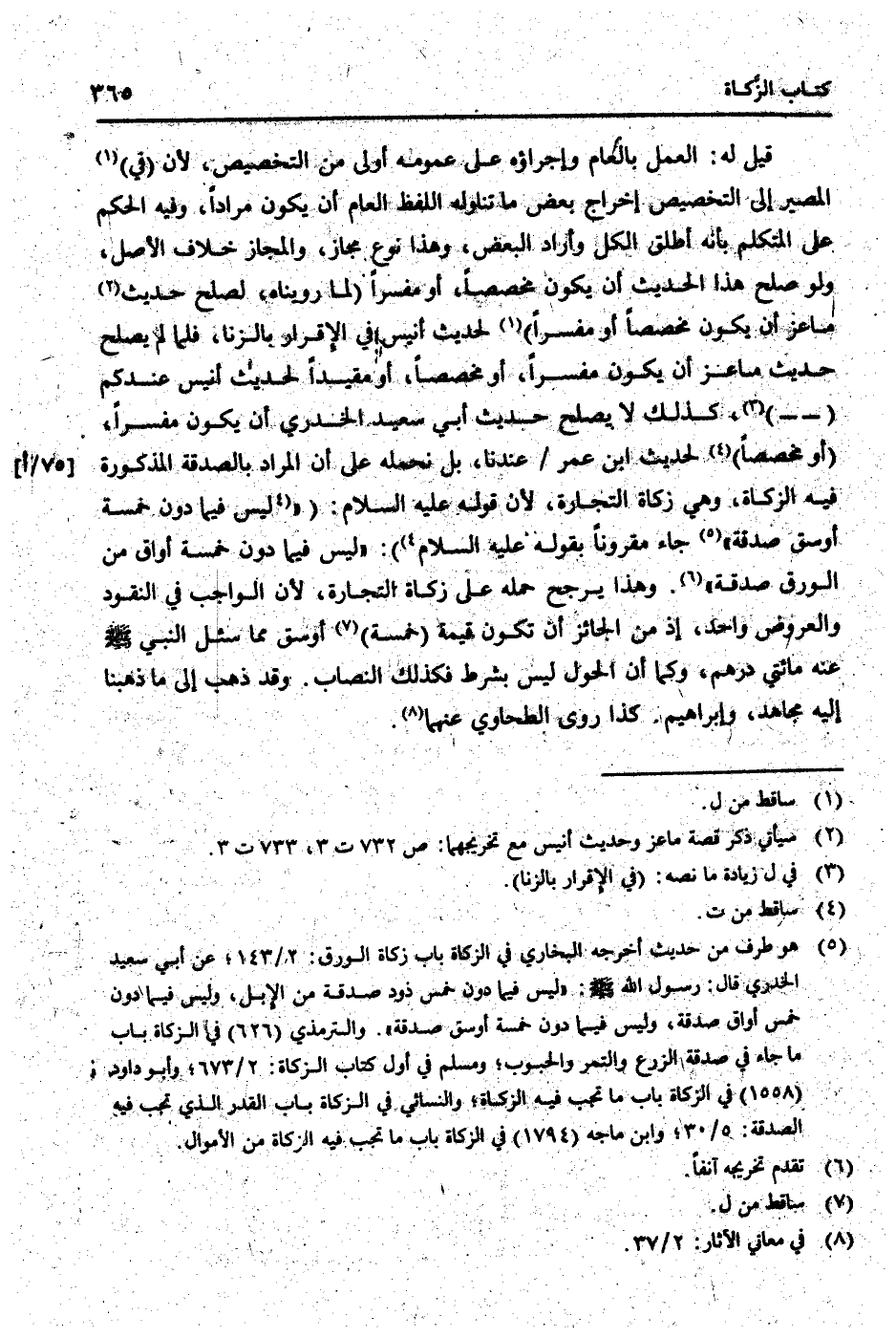 قيل لَهُ: الْعَمَل بِالْعَام وإجراؤه على عُمُومه أولى من التَّخْصِيص، لِأَن (فِي) الْمصير إِلَى التَّخْصِيص إِخْرَاج بعض مَا تنَاوله اللَّفْظ الْعَام أَن يكون مرَادا، وَفِيه الحكم على الْمُتَكَلّم بِأَنَّهُ أطلق الْكل وَأَرَادَ الْبَعْض، وَهَذَا نوع مجَاز، وَالْمجَاز خلاف الأَصْل، وَلَو صلح هَذَا الحَدِيث أَن يكون مُخَصّصا، أَو مُفَسرًا (لما روينَاهُ، لصلح حَدِيث مَاعِز أَن يكون مُخَصّصا أَو مُفَسرًا) لحَدِيث أنيس فِي الْإِقْرَار بِالزِّنَا، فَلَمَّا لم يصلح حَدِيث مَاعِز أَن يكون مُفَسرًا، أَو مُخَصّصا، أَو مُقَيّدا لحَدِيث أنيس عنْدكُمْ، كَذَلِك لَا يصلح حَدِيث أبي سعيد الْخُدْرِيّ أَن يكون مُفَسرًا، (أَو مُخَصّصا) لحَدِيث ابْن عمر / عندنَا، بل نحمله على أَن المُرَاد بِالصَّدَقَةِ الْمَذْكُورَة فِيهِ الزَّكَاة، وَهِي زَكَاة التِّجَارَة، لِأَن قَوْله عَلَيْهِ السَّلَام: (" لَيْسَ فِيمَا دون خَمْسَة أسق صَدَقَة " جَاءَ مَقْرُونا بقوله عَلَيْهِ السَّلَام) : " لَيْسَ فِيمَا دون خَمْسَة أَوَاقٍ من الْوَرق صَدَقَة ". وَهَذَا يرجح حمله على زَكَاة التِّجَارَة، لِأَن الْوَاجِب فِي النُّقُود وَالْعرُوض وَاحِد، إِذْ من الْجَائِز أَن تكون قيمَة (خَمْسَة) أوسق مِمَّا سُئِلَ النَّبِي [صلى الله عَلَيْهِ وَسلم] عَنهُ مِائَتي دِرْهَم، وكما أَن الْحول لَيْسَ بِشَرْط فَكَذَلِك النّصاب. وَقد ذهب إِلَى مَا ذَهَبْنَا إِلَيْهِ مُجَاهِد، وَإِبْرَاهِيم. كَذَا روى الطَّحَاوِيّ عَنْهُمَا.