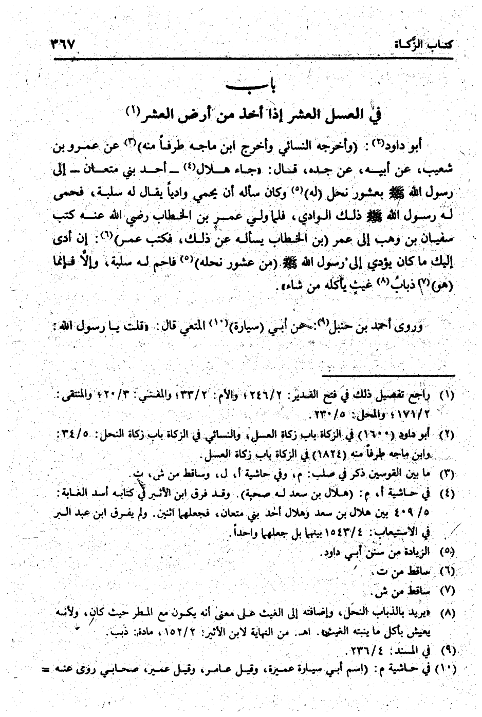 أَبُو دَاوُد: (وَأخرجه النَّسَائِيّ وَأخرج ابْن مَاجَه طرفا مِنْهُ) عَن عَمْرو بن شُعَيْب، عَن أَبِيه، عَن جده، قَالَ: " جَاءَ هِلَال - أحد بني متعان - إِلَى رَسُول الله [صلى الله عَلَيْهِ وَسلم] بعشور نحل (لَهُ) وَكَانَ سَأَلَهُ أَن يحمي وَاديا يُقَال لَهُ سلبة، فحمى لَهُ رَسُول الله [صلى الله عَلَيْهِ وَسلم] ذَلِك الْوَادي، فَلَمَّا ولي عمر بن الْخطاب رَضِي الله عَنهُ كتب سُفْيَان بن وهب إِلَى عمر (بن الْخطاب يسْأَله عَن ذَلِك، فَكتب عمر) : إِن أدّى إِلَيْك مَا كَانَ يُؤَدِّي إِلَى رَسُول الله [صلى الله عَلَيْهِ وَسلم] (من عشور نحله) فَاحم لَهُ سلبة، وَإِلَّا فَإِنَّمَا (هُوَ) ذُبَاب غيث يَأْكُلهُ من شَاءَ ".