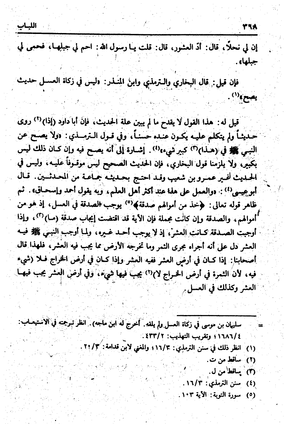 قيل لَهُ: هَذَا القَوْل لَا يقْدَح مَا لم يبين عِلّة الحَدِيث، فَإِن أَبَا دَاوُد (إِذا) روى حَدِيثا وَلم يتَكَلَّم عَلَيْهِ يكون عِنْده حسنا، وَفِي قَول التِّرْمِذِيّ: " وَلَا يَصح عَن النَّبِي [صلى الله عَلَيْهِ وَسلم] فِي (هَذَا) كَبِير شَيْء ". إِشَارَة إِلَى أَنه يَصح فِيهِ وَإِن كَانَ ذَلِك لَيْسَ بكبير، وَلَا يلْزمنَا قَول البُخَارِيّ، فَإِن الحَدِيث الصَّحِيح لَيْسَ مَوْقُوفا عَلَيْهِ، وَلَيْسَ فِي الحَدِيث غير عَمْرو بن شُعَيْب وَقد احْتج بحَديثه جمَاعَة من الْمُحدثين. قَالَ أَبُو عِيسَى: " وَالْعَمَل على هَذَا عِنْد أَكثر أهل الْعلم، وَبِه يَقُول أَحْمد وَإِسْحَاق ". ثمَّ ظَاهر قَوْله تَعَالَى: {خُذ من أَمْوَالهم صَدَقَة} يُوجب الصَّدَقَة فِي الْعَسَل، إِذْ هُوَ من أَمْوَالهم، وَالصَّدَََقَة وَإِن كَانَت مجملة فَإِن الْآيَة قد اقْتَضَت إِيجَاب صَدَقَة (مَا) ، وَإِذا أوجبت الصَّدَقَة كَانَت الْعشْر، إِذْ لَا يُوجب أحد غَيره، وَلما أوجب النَّبِي [صلى الله عَلَيْهِ وَسلم] فِيهِ الْعشْر دلّ على أَنه أجراه مجْرى الثَّمر وَمَا تخرجه الأَرْض مِمَّا يجب فِيهِ الْعشْر، فَلهَذَا قَالَ أَصْحَابنَا: إِذا كَانَ فِي أَرض الْعشْر فَفِيهِ الْعشْر وَإِذا كَانَ فِي أَرض الْخراج فَلَا (شَيْء فِيهِ، لِأَن الثَّمَرَة فِي أَرض الْخراج لَا) يجب فِيهَا شَيْء، وَفِي أَرض الْعشْر يجب فِيهَا الْعشْر وَكَذَلِكَ فِي الْعَسَل.