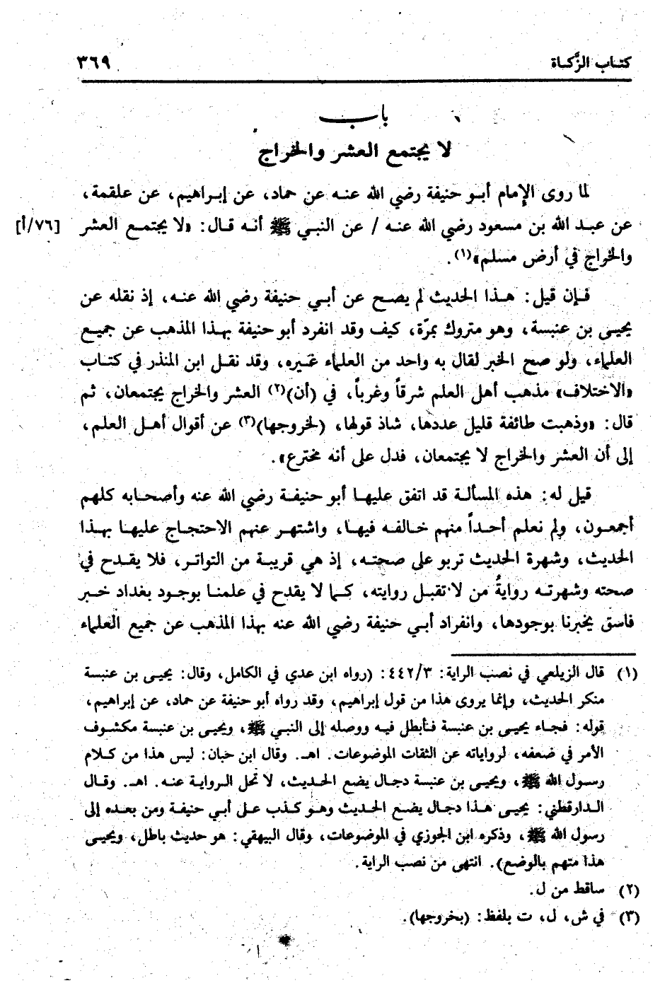 لما روى الإِمَام أَبُو حنيفَة رَضِي الله عَنهُ عَن حَمَّاد، عَن إِبْرَاهِيم، عَن عَلْقَمَة، عَن عبد الله بن مَسْعُود رَضِي الله عَنهُ / عَن النَّبِي [صلى الله عَلَيْهِ وَسلم] أَنه قَالَ: " لَا يجْتَمع الْعشْر وَالْخَرَاج فِي أَرض مُسلم ".