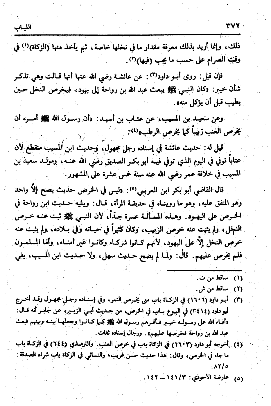 قَالَ القَاضِي أَبُو بكر ابْن الْعَرَبِيّ: " لَيْسَ فِي الْخرص حَدِيث يَصح إِلَّا وَاحِد وَهُوَ الْمُتَّفق عَلَيْهِ، وَهُوَ مَا روينَاهُ فِي حديقة الْمَرْأَة، قَالَ: ويليه حَدِيث ابْن رَوَاحَة فِي الْخرص على الْيَهُود. وَهَذِه الْمَسْأَلَة عسرة جدا، لِأَن النَّبِي [صلى الله عَلَيْهِ وَسلم] ثَبت عَنهُ خرص النّخل، وَلم يثبت عَنهُ خرص الزَّبِيب، وَكَانَ كثيرا فِي حَيَاته وَفِي بِلَاده، وَلم يثبت عَنهُ خرص النّخل إِلَّا على الْيَهُود، لأَنهم كَانُوا شُرَكَاء وَكَانُوا غير أُمَنَاء، وَأما الْمُسلمُونَ فَلم يخرص عَلَيْهِم. قَالَ: وَلما لم يَصح حَدِيث سهل، وَلَا حَدِيث ابْن الْمسيب، بَقِي