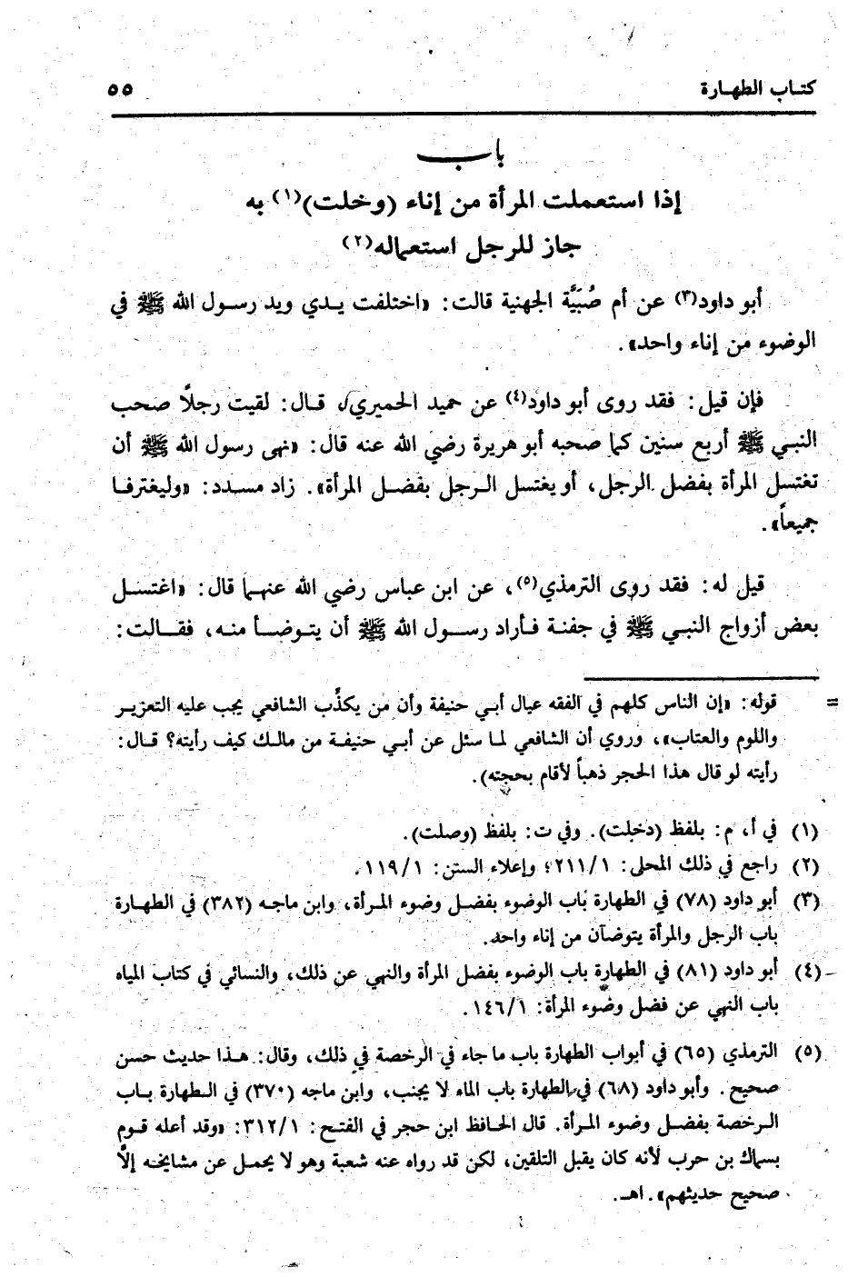 أَبُو دَاوُد عَن أم حبية الجهنية قَالَت: " اخْتلفت يَدي وَيَد رَسُول الله [صلى الله عَلَيْهِ وَسلم] فِي الْوضُوء من إِنَاء وَاحِد ".