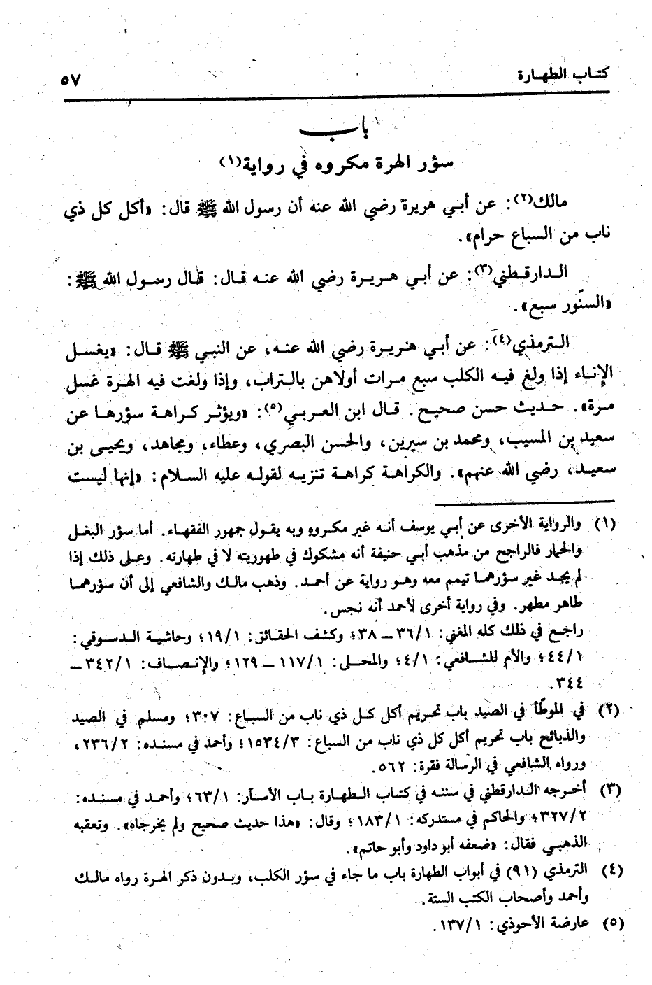 الدَّارَقُطْنِيّ: عَن أبي هُرَيْرَة رَضِي الله عَنهُ قَالَ: قَالَ رَسُول الله [صلى الله عَلَيْهِ وَسلم] : " السنور سبع ".
