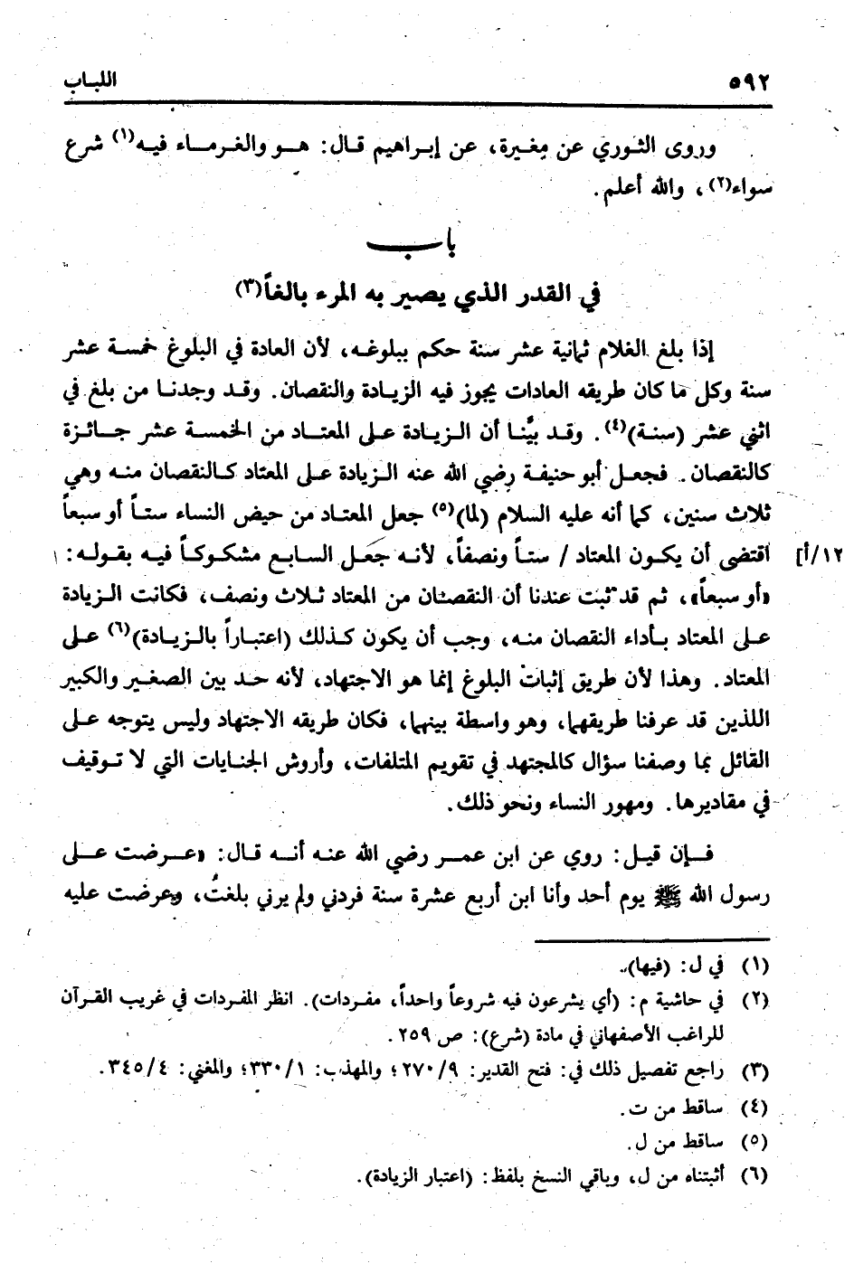 إِذا بلغ الْغُلَام ثَمَانِيَة عشر سنة حكم بِبُلُوغِهِ، لِأَن الْعَادة فِي الْبلُوغ خَمْسَة عشر سنة وكل مَا كَانَ طَرِيقه الْعَادَات يجوز فِيهِ الزِّيَادَة وَالنُّقْصَان. وَقد وجدنَا من بلغ فِي اثْنَي عشر (سنة) . وَقد بَينا أَن الزِّيَادَة على الْمُعْتَاد من الْخَمْسَة عشر جَائِزَة كالنقصان. فَجعل أَبُو حنيفَة رَضِي الله عَنهُ الزِّيَادَة على الْمُعْتَاد كالنقصان مِنْهُ وَهِي ثَلَاث سِنِين، كَمَا أَنه عَلَيْهِ السَّلَام (لما) جعل الْمُعْتَاد من حيض النِّسَاء سِتا أَو سبعا اقْتضى أَن يكون الْمُعْتَاد / سِتا وَنصفا، لِأَنَّهُ جعل السَّابِع مشكوكا فِيهِ بقوله: " أَو سبعا "، ثمَّ قد ثَبت عندنَا أَن النُّقْصَان من الْمُعْتَاد ثَلَاث وَنصف، فَكَانَت الزِّيَادَة على الْمُعْتَاد بأَدَاء النُّقْصَان مِنْهُ، وَجب أَن يكون كَذَلِك (اعْتِبَارا بِالزِّيَادَةِ) على الْمُعْتَاد. وَهَذَا لِأَن طَرِيق إِثْبَات الْبلُوغ إِنَّمَا هُوَ الِاجْتِهَاد، لِأَنَّهُ حد بَين الصَّغِير وَالْكَبِير اللَّذين قد عرفنَا طريقهما، وَهُوَ وَاسِطَة بَينهمَا، فَكَانَ طَرِيقه الِاجْتِهَاد وَلَيْسَ يتَوَجَّه على الْقَائِل بِمَا وَصفنَا سُؤال كالمجتهد فِي تَقْوِيم الْمُتْلفَات، وأروش الْجِنَايَات الَّتِي لَا تَوْقِيف فِي مقاديرها. ومهور النِّسَاء وَنَحْو ذَلِك.