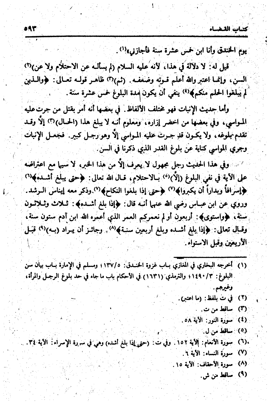وَفِي هَذَا الحَدِيث رجل مَجْهُول لَا يعرف إِلَّا من هَذَا الْخَبَر، لَا سِيمَا مَعَ اعتراضه على الْآيَة فِي نفي الْبلُوغ (إِلَّا) بالاحتلام، قَالَ الله تَعَالَى: {حَتَّى يبلغ أشده} {إسرافا وبدارا أَن يكبروا} {حَتَّى إِذا بلغُوا النِّكَاح} وَذكر مَعَه إيناس الرشد. وَرُوِيَ عَن ابْن عَبَّاس رَضِي الله عَنْهُمَا أَنه قَالَ: {إِذا بلغ أشده} : ثَلَاث وَثَلَاثُونَ سنة، {واستوى} : أَرْبَعُونَ أَو لم نُعَمِّركُمْ الْعُمر الَّذِي أعْمرهُ الله ابْن آدم سِتُّونَ سنة، وَقَالَ تَعَالَى: {إِذا بلغ أشده وَبلغ أَرْبَعِينَ سنة} . وَجَائِز أَن يُرَاد (بِهِ) قبل الْأَرْبَعين وَقبل الاسْتوَاء.