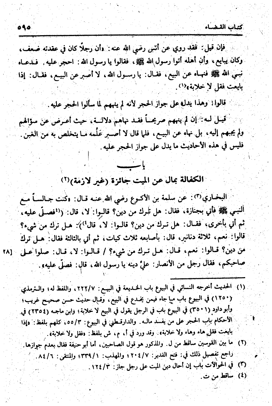البُخَارِيّ: عَن سَلمَة بن الْأَكْوَع رَضِي الله عَنهُ قَالَ: " كنت جَالِسا مَعَ النَّبِي [صلى الله عَلَيْهِ وَسلم] فَأتي بِجنَازَة، فَقَالَ: هَل ترك من دين؟ قَالُوا: لَا، قَالَ: (فصلى عَلَيْهِ، ثمَّ أُتِي بِأُخْرَى، فَقَالَ: هَل ترك من دين؟ قَالُوا: لَا، قَالَ) : هَل ترك من شَيْء؟ قَالُوا: نعم، ثَلَاثَة دَنَانِير، قَالَ: بأصابعه ثَلَاث كيات، ثمَّ أُتِي بالثالثة فَقَالَ: هَل ترك من دين؟ قَالُوا: نعم، قَالَ: هَل ترك من شَيْء؟ قَالُوا: لَا، قَالَ: صلوا على صَاحبكُم، فَقَالَ رجل من الْأَنْصَار: عَليّ دينه يَا رَسُول الله، قَالَ: فصلى عَلَيْهِ ".